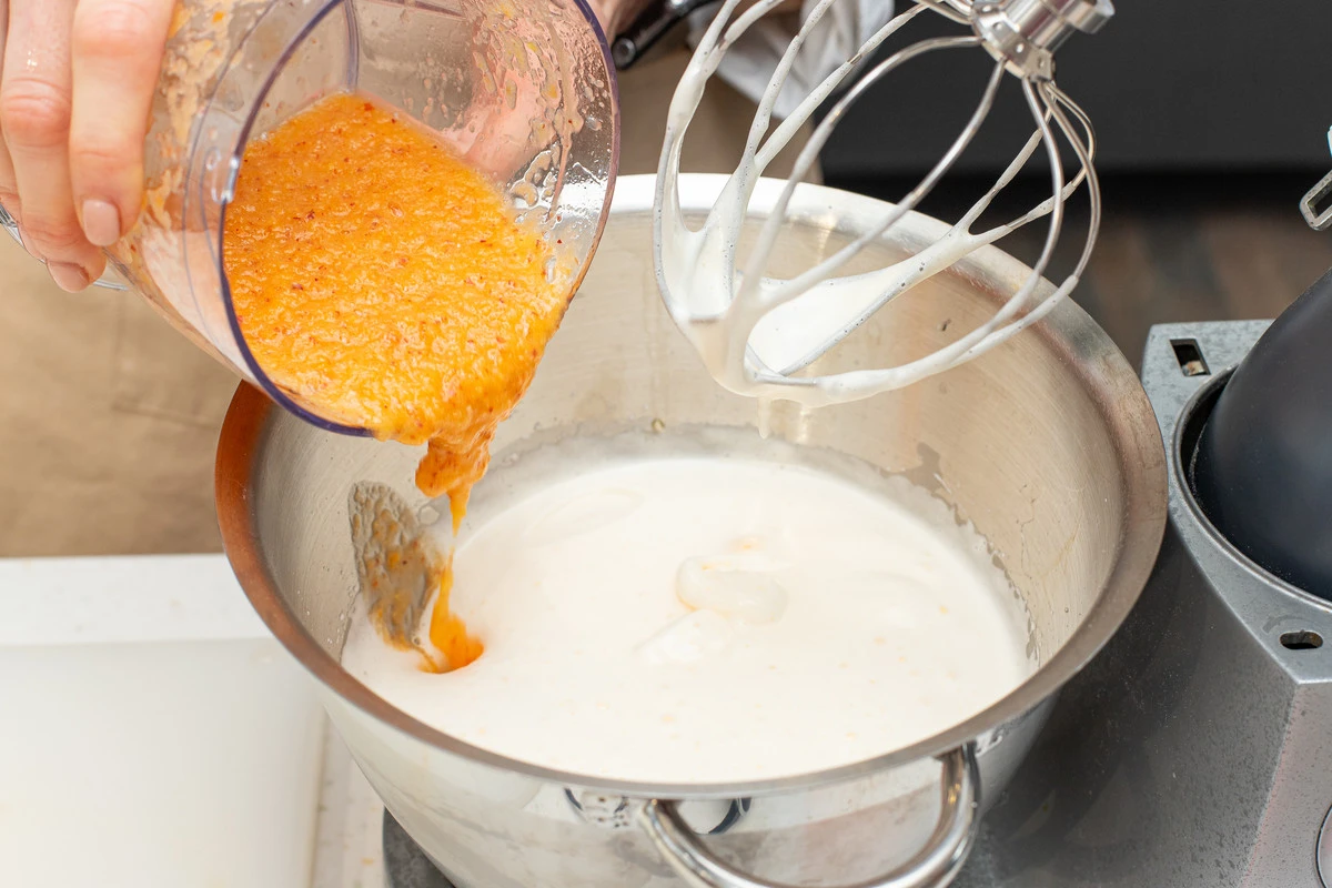Добавьте ко взбитым с сахаром яйцам 200 мл получившегося фруктового пюре. Перемешайте миксером.