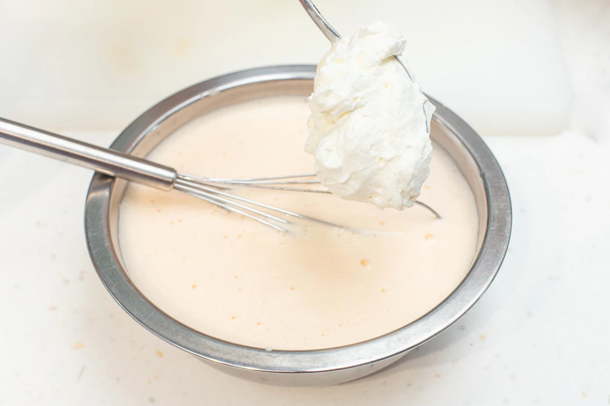 Взбейте сливки и добавьте к подготовленной ранее основе, хорошо смешайте венчиком.