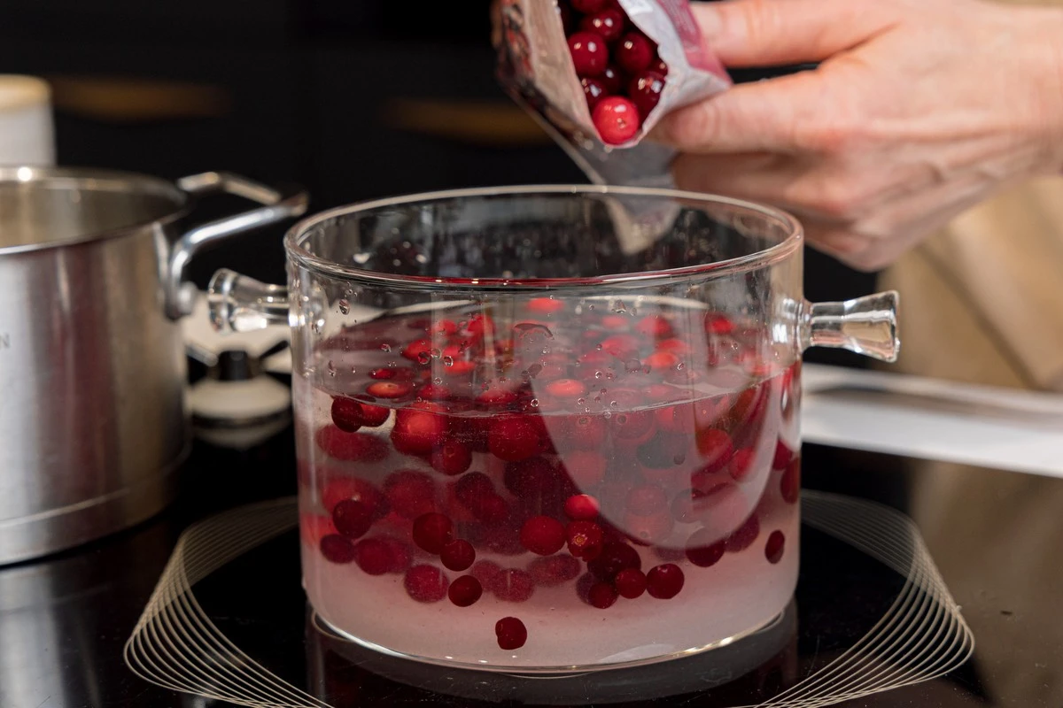 Положите клюкву, предварительно размораживать не нужно.