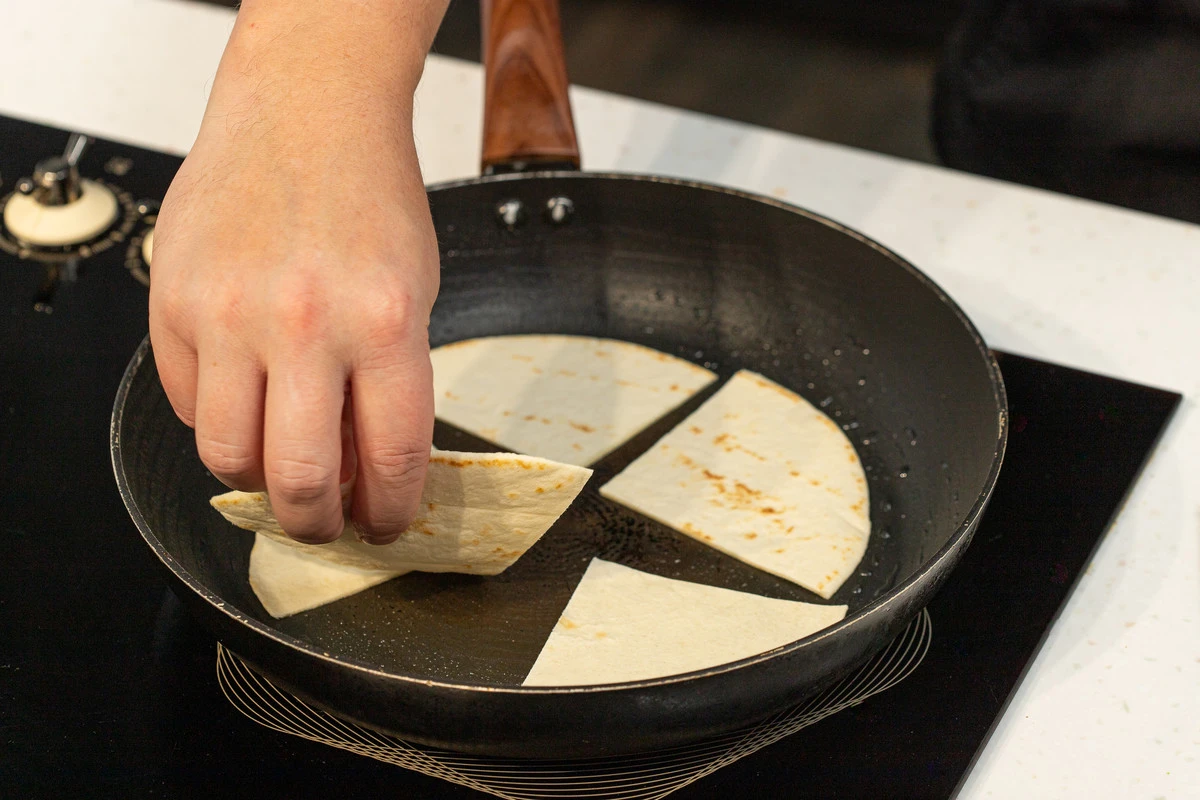 Тортилью разрежьте на четыре части и слегка поджарьте на сухой сковороде.