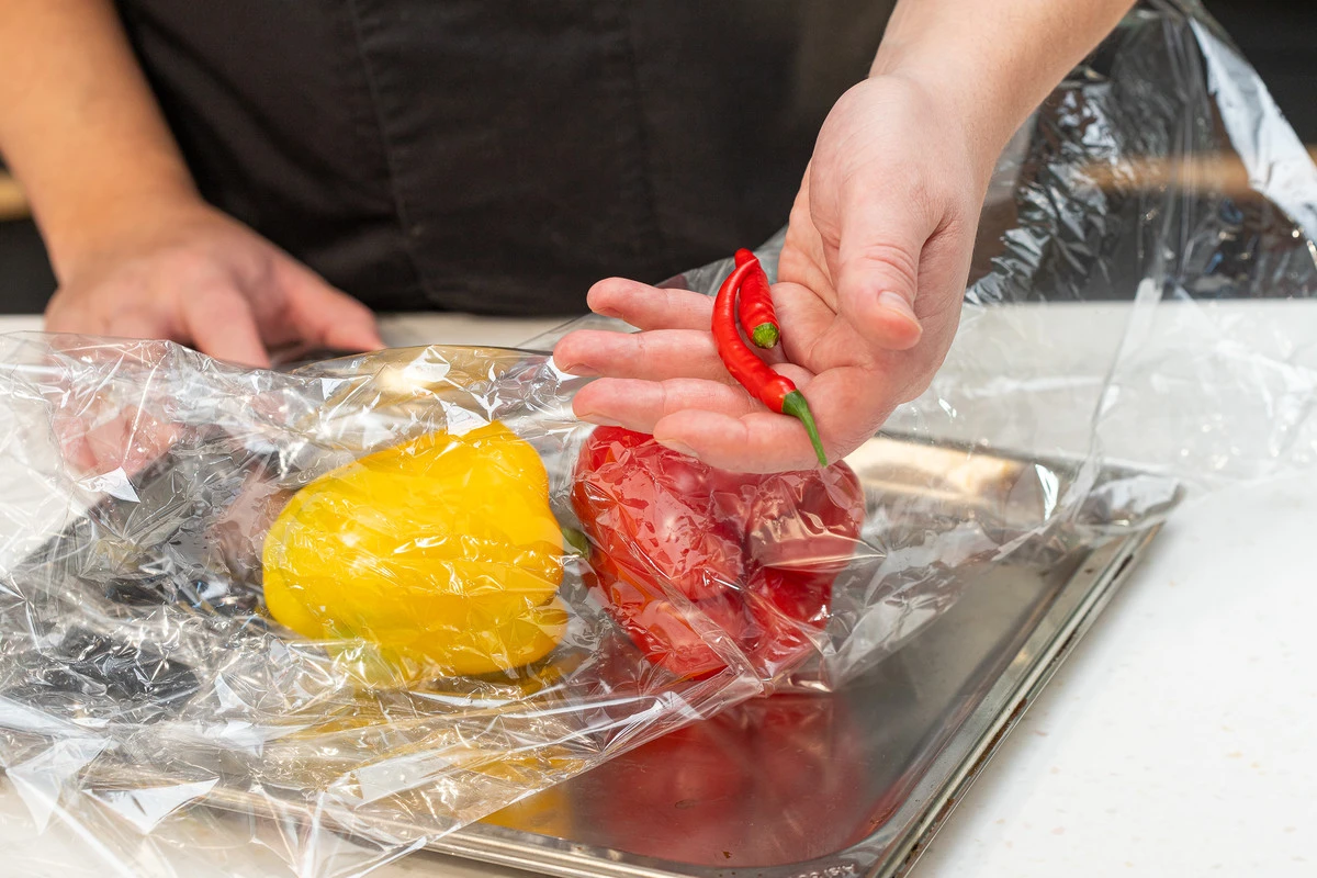 Запеките перцы (болгарский и чили) в фольге в духовке при температуре 200 градусов в течение 15 минут. Затем выключите духовку, оставьте их внутри на 15 минут, чтобы они дошли до готовности.