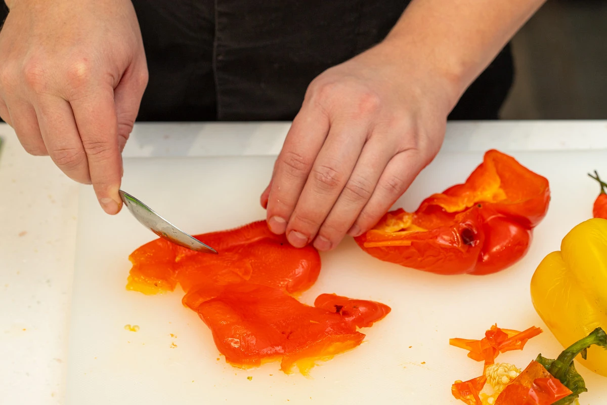Достаньте перцы из духовки, снимите с них кожицу, удалите внутренности.
