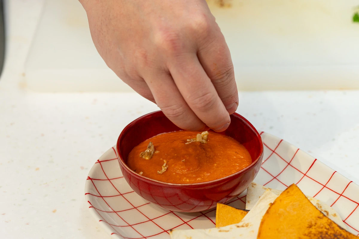 Подавайте мухаммару с подпечёнными треугольниками из тортильи.