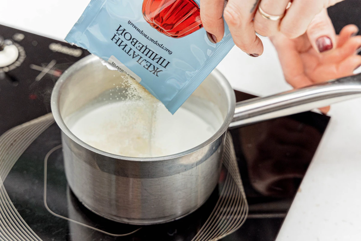 Сливки вылейте в сотейник, добавьте желатин и размешайте. Нагрейте сливки до 60-70 °C до растворения желатина, постоянно помешивая.