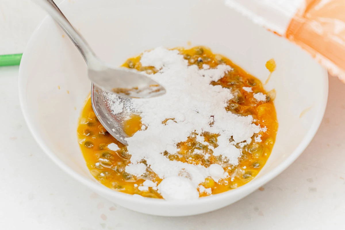 Разрежьте плоды маракуйи пополам, выскребите мякоть, добавьте сахарную пудру и перемешайте.