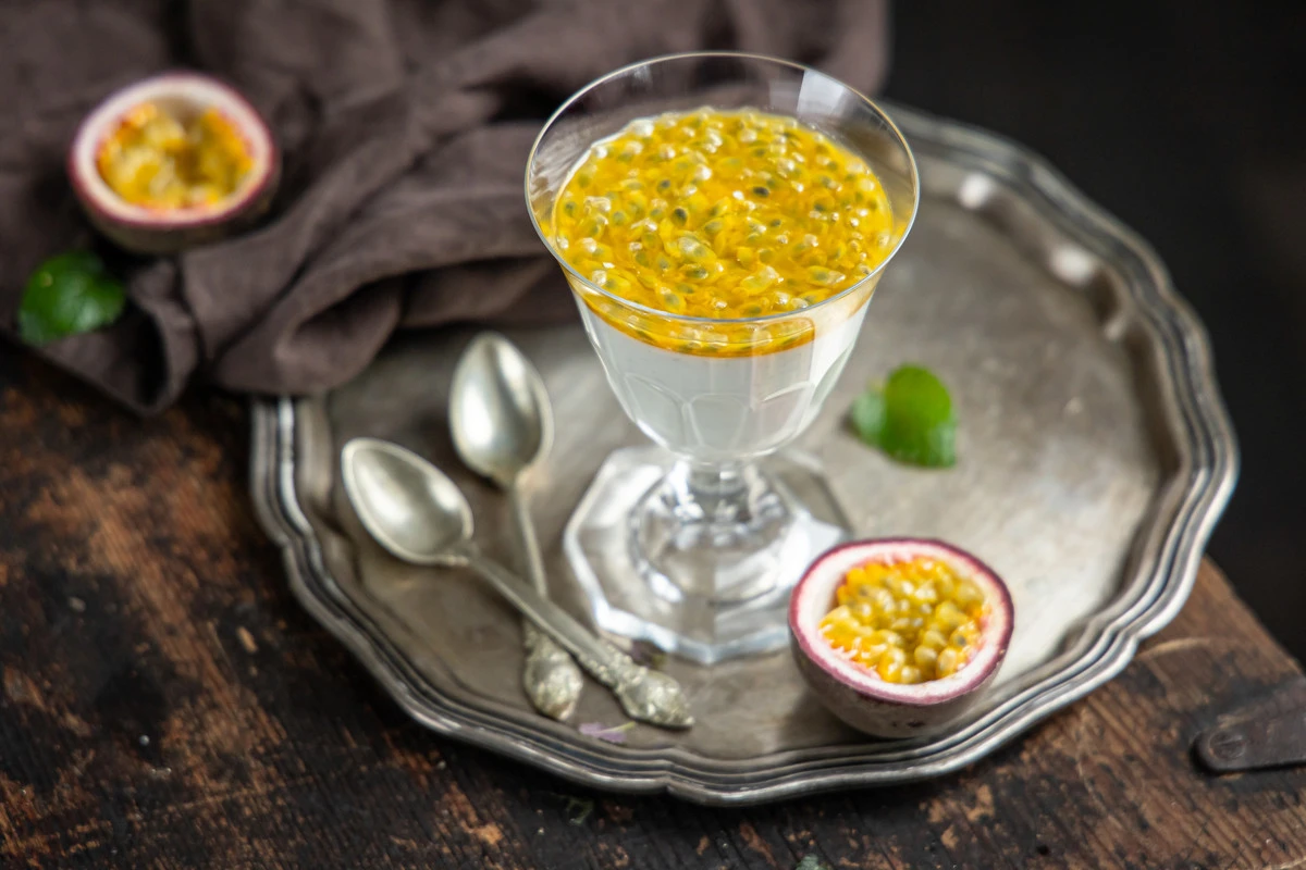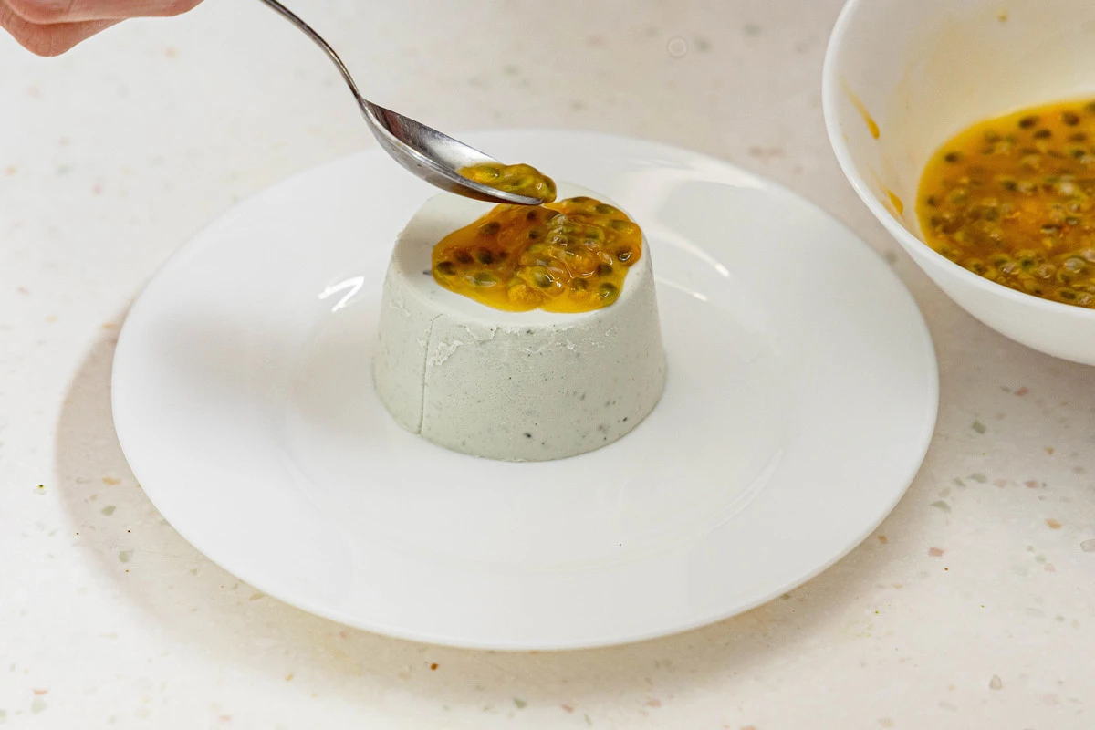 Вылейте маракуйю на застывший десерт и подавайте.