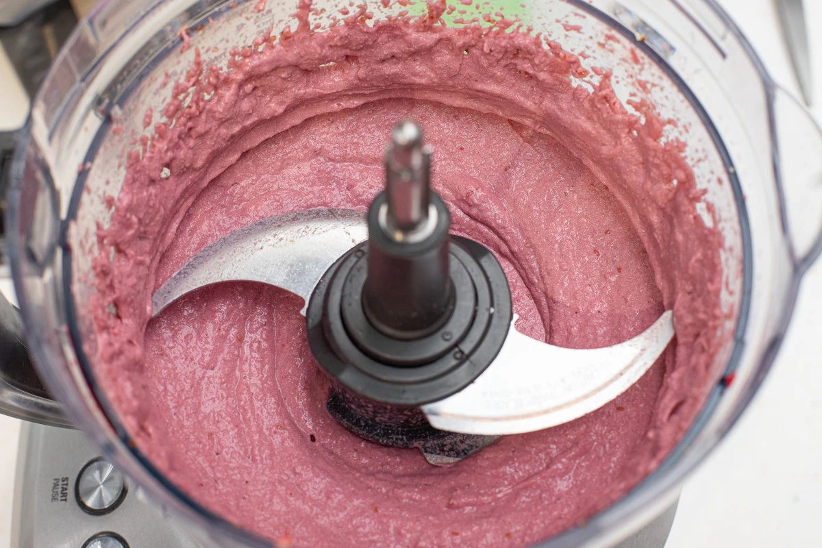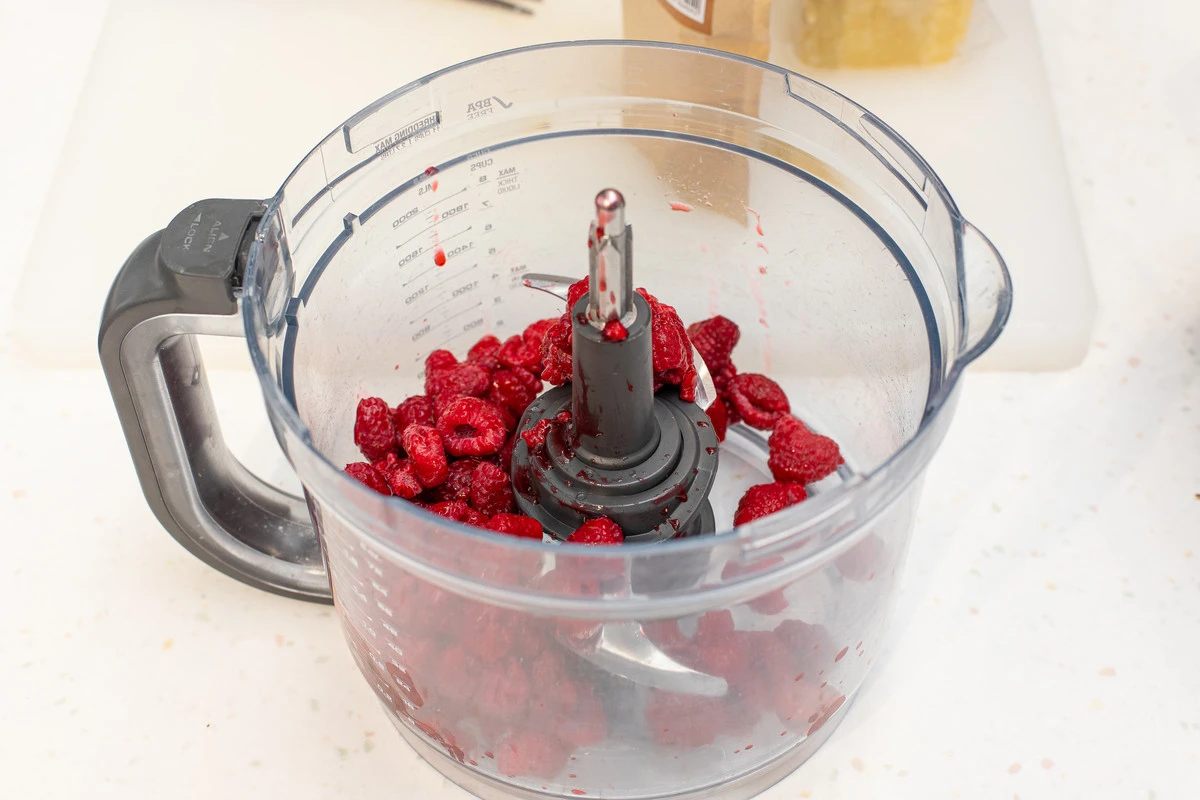 Малину выложите в чашу кухонного комбайна или блендера. Заранее размораживать не нужно. Ягоды можете добавлять постепенно: сначала положить 200 г, при необходимости после измельчения добавляя ещё.