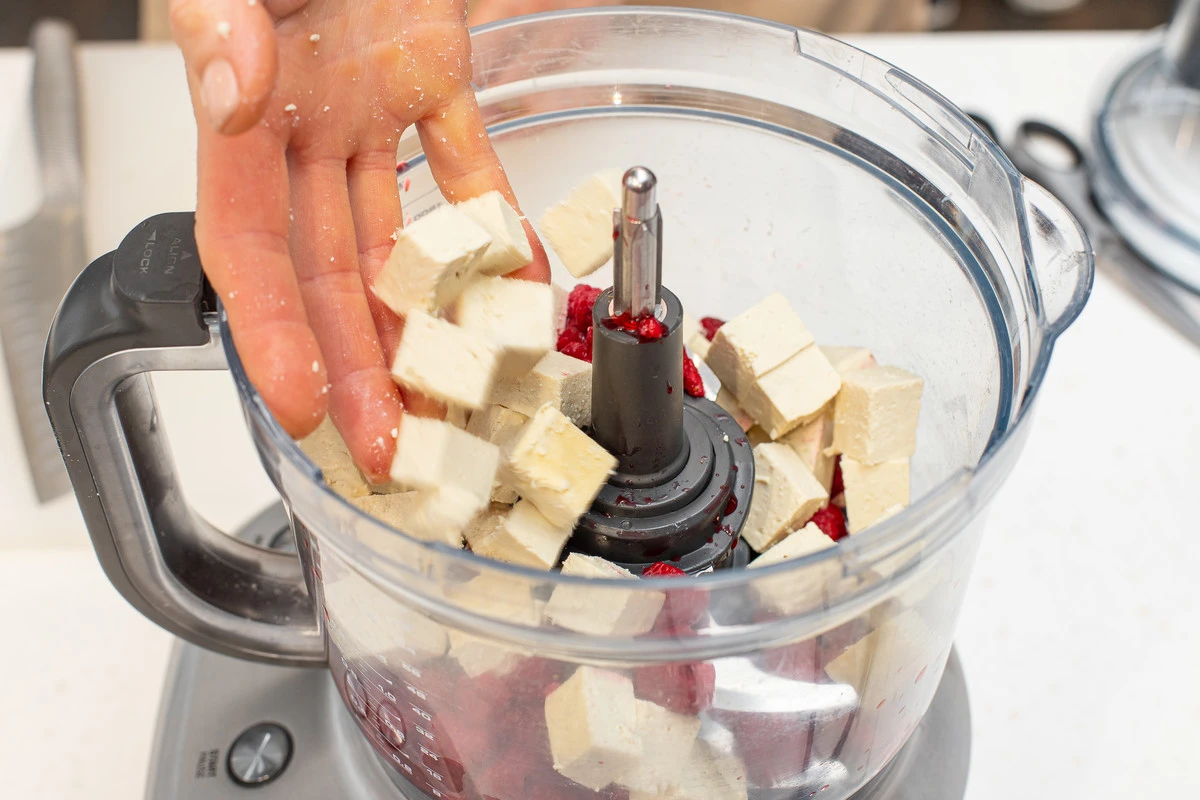 Добавьте к малине сахар и положите тофу. Можете влить сироп от варенья, заменив им сахар.