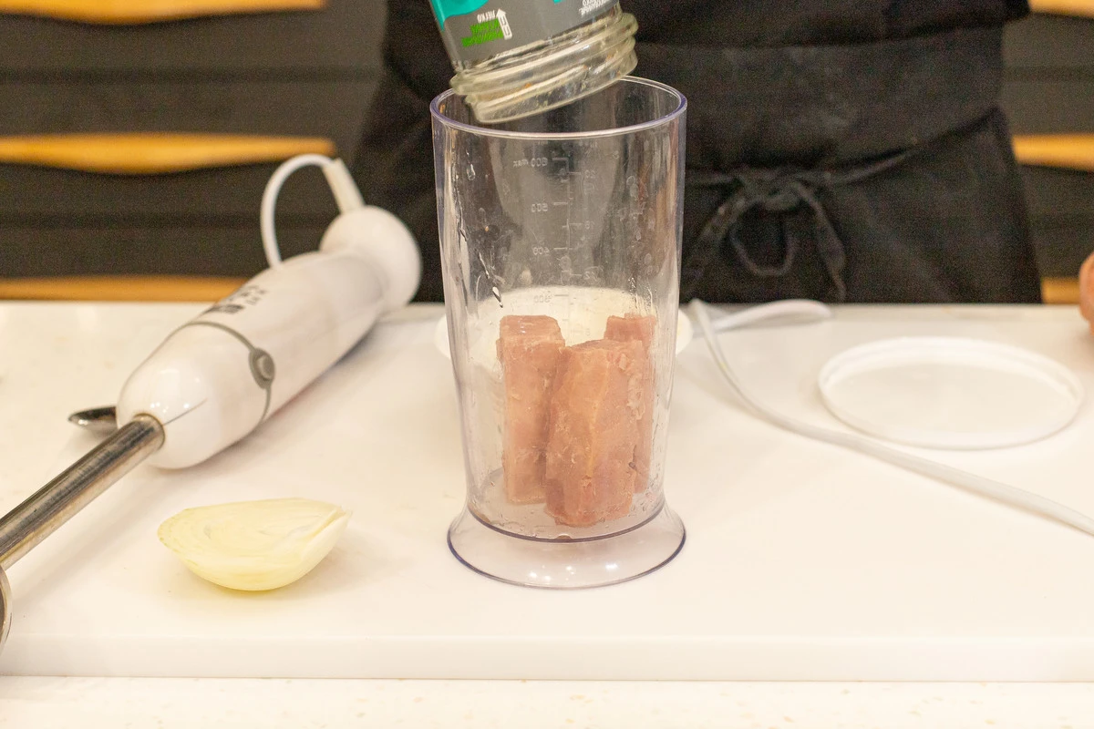 Кусочки тунца выложите в стакан блендера, жидкость из банки пока не выливайте.