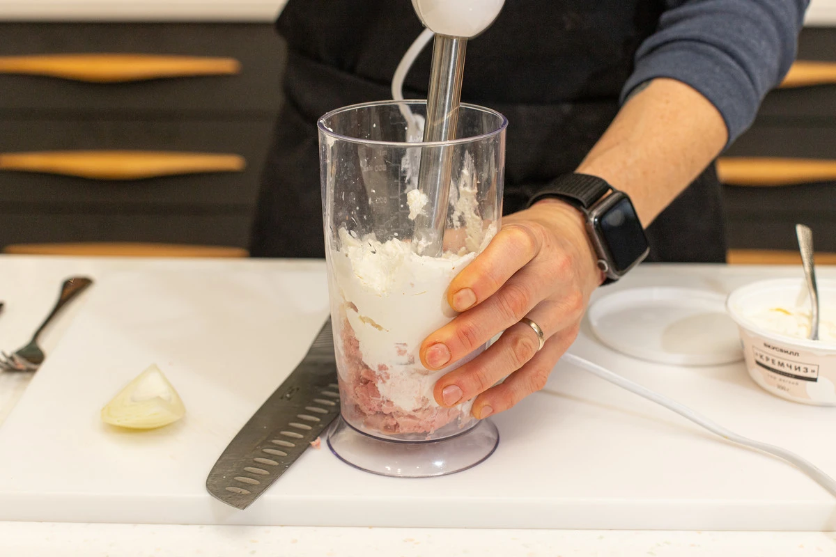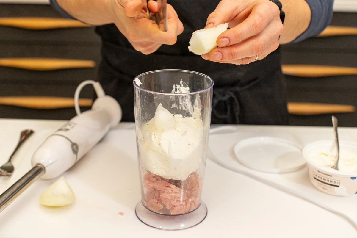 Добавьте к тунцу творожный сыр и четвертинку белого лука, пробейте всё вместе до однородности.