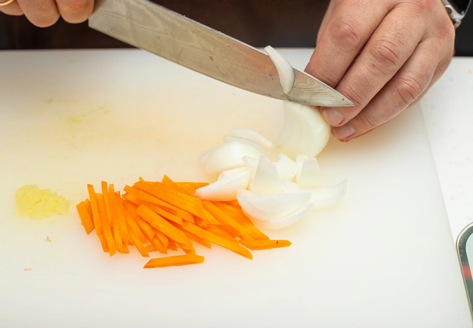 Морковь натрите или порежьте тонкой соломкой, лук порубите полукольцами.