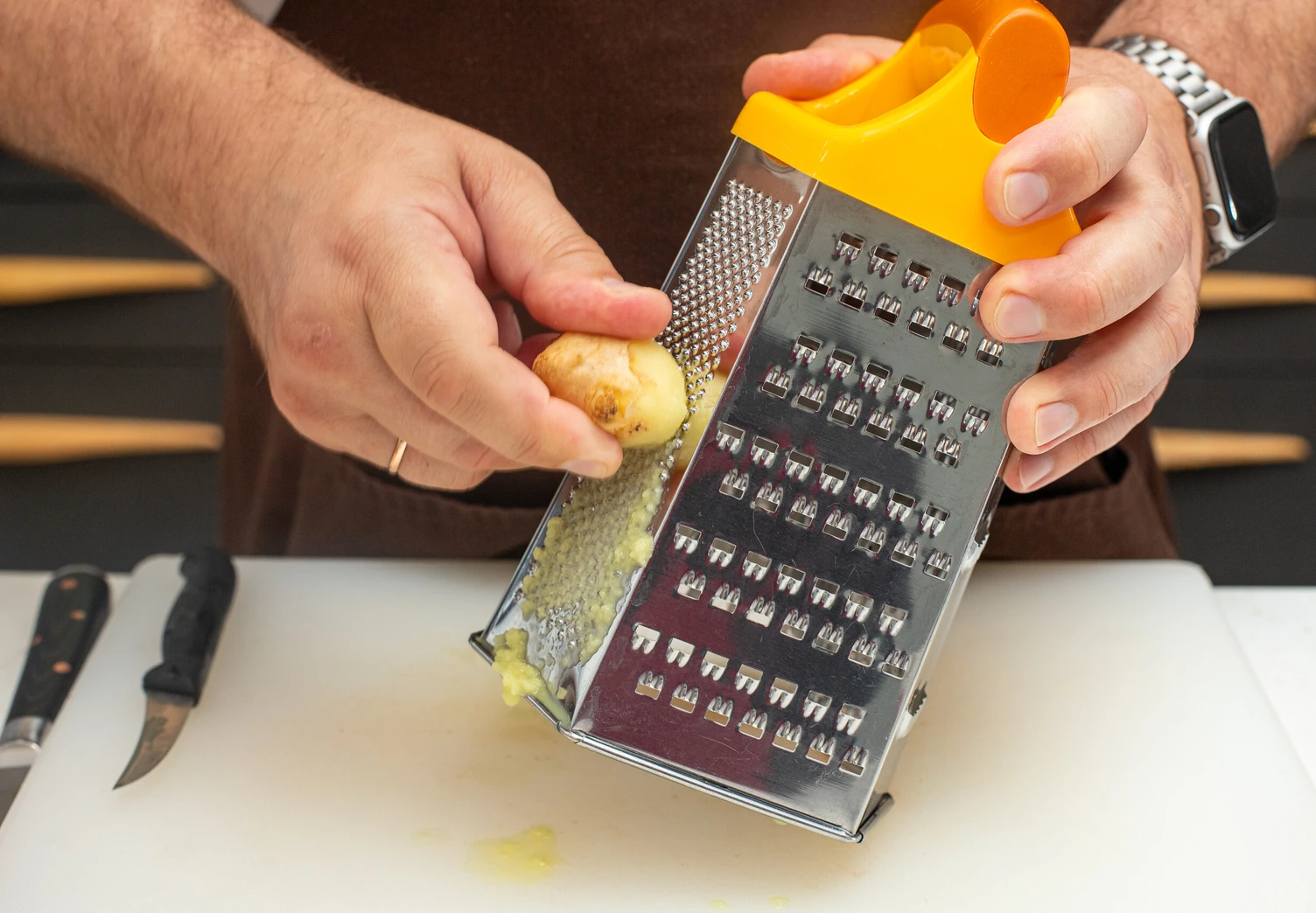 Добавьте в сковороду имбирь, морковь, лук и продолжайте жарить все ингредиенты на сильном огне ещё около 5 минут.