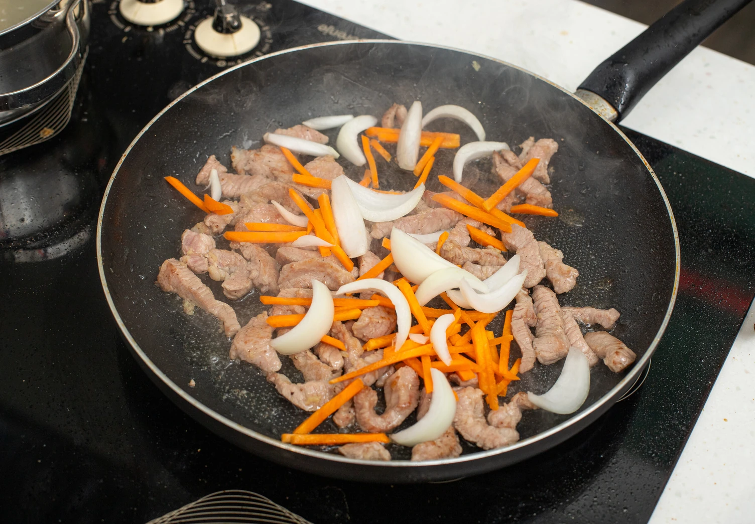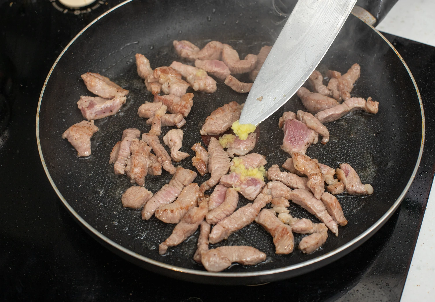 Разогрейте растительное масло и обжарьте свинину на сильном огне.