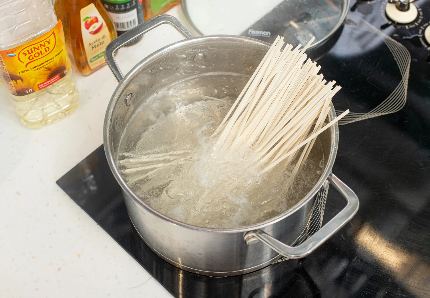 Добавьте соевый соус, кунжутное масло, уксус и сахар. Перемешайте, убавьте огонь до среднего и готовьте ещё 2-3 минуты.