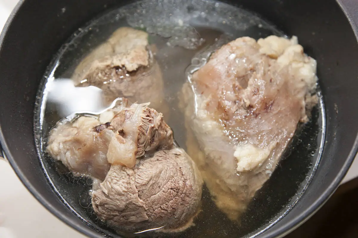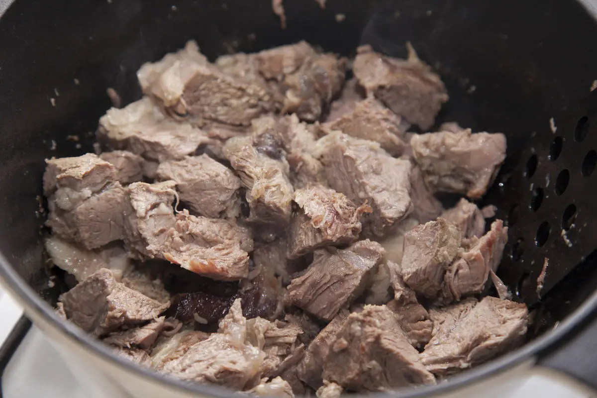 Мясо залейте холодной водой (1,5 - 2 литра) и доведите до кипения, снимите пену, убавьте огонь до минимума и варите до мягкости мяса, около двух часов.
