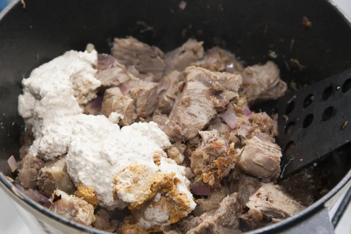 В кастрюле разогрейте сливочное масло, обжаривайте мясо до румяной корочки, добавьте лук, готовьте до прозрачности лука.