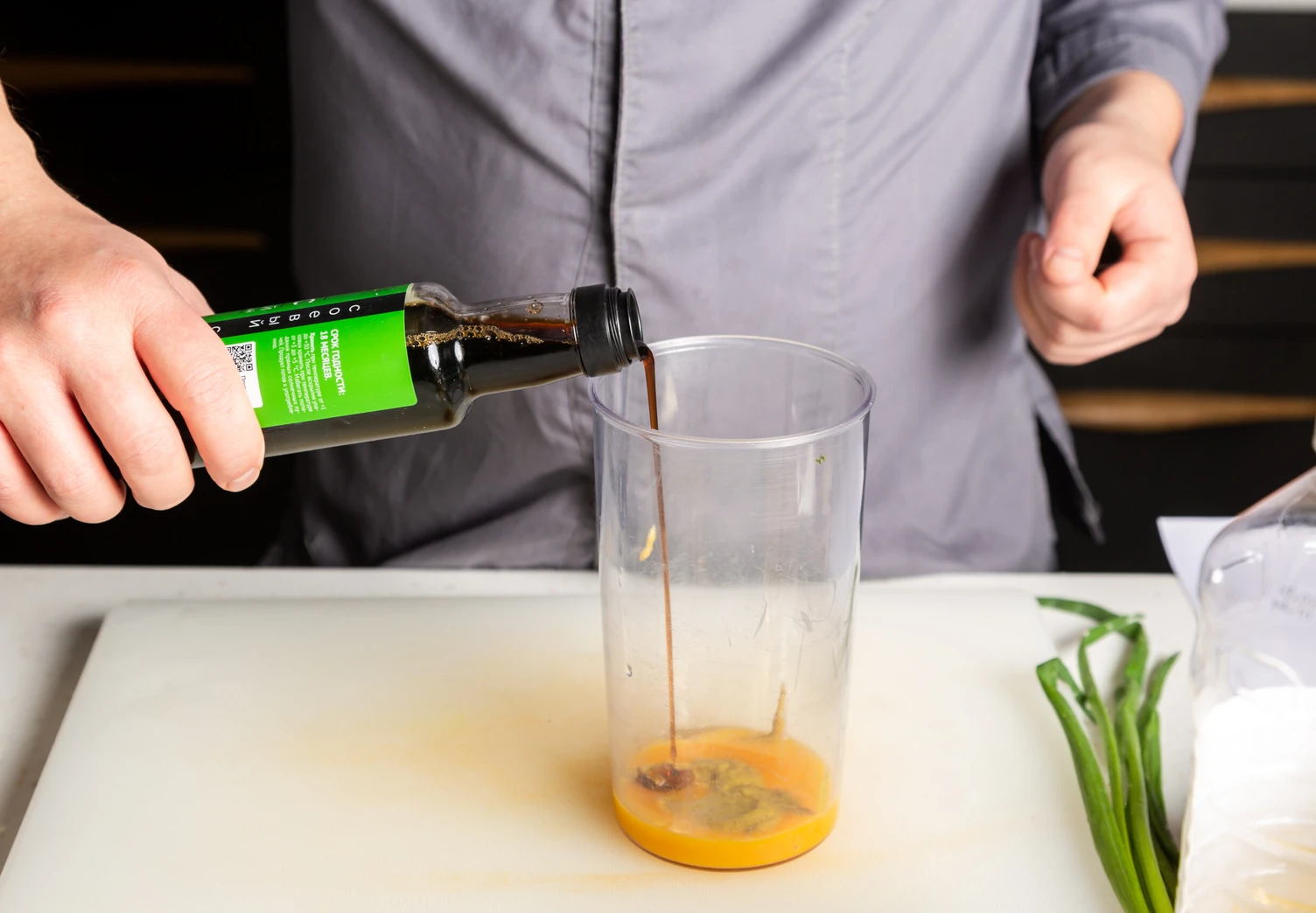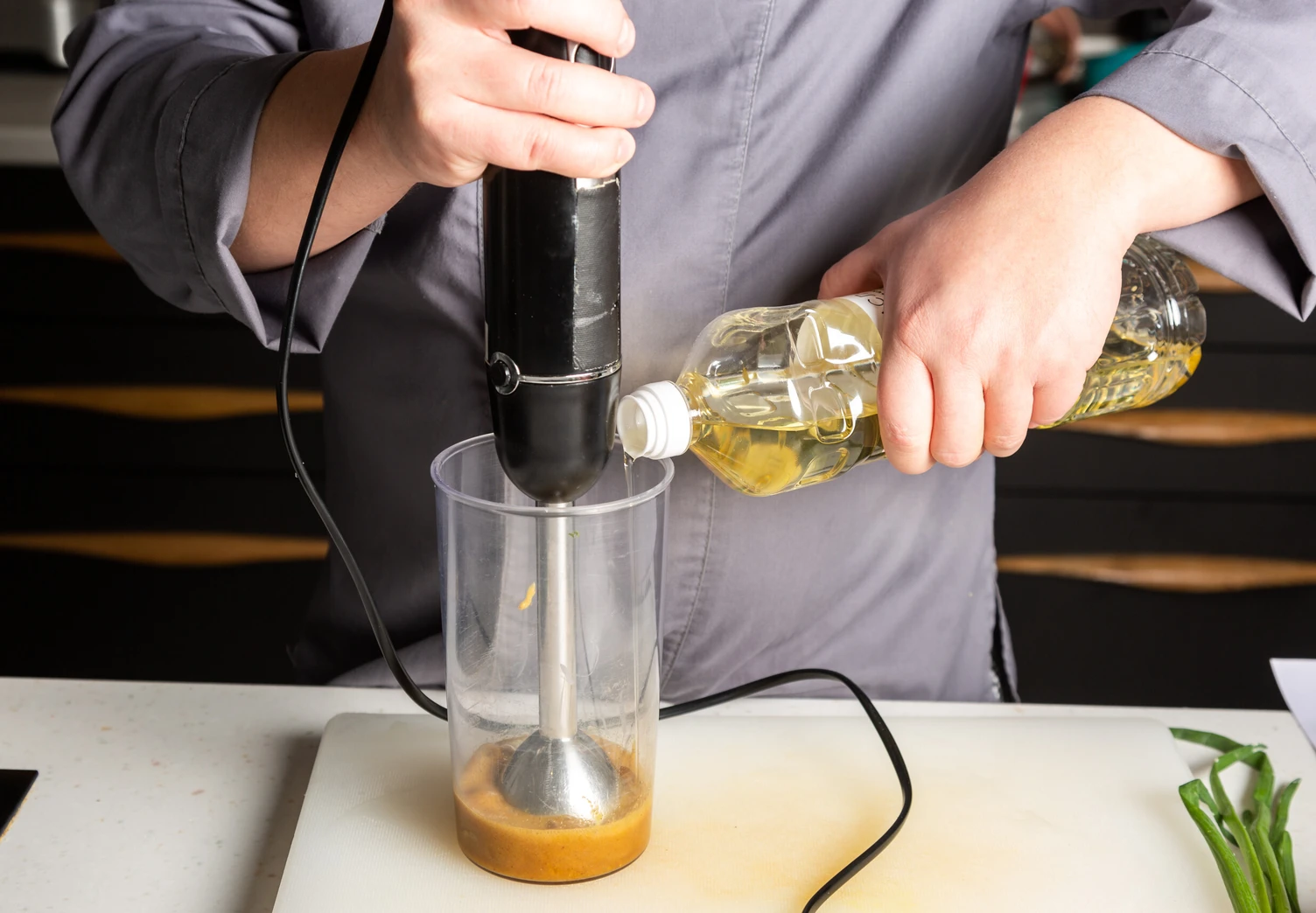 Для майонеза смешайте в высоком стакане все ингредиенты, кроме масла, и пробейте погружным блендером.