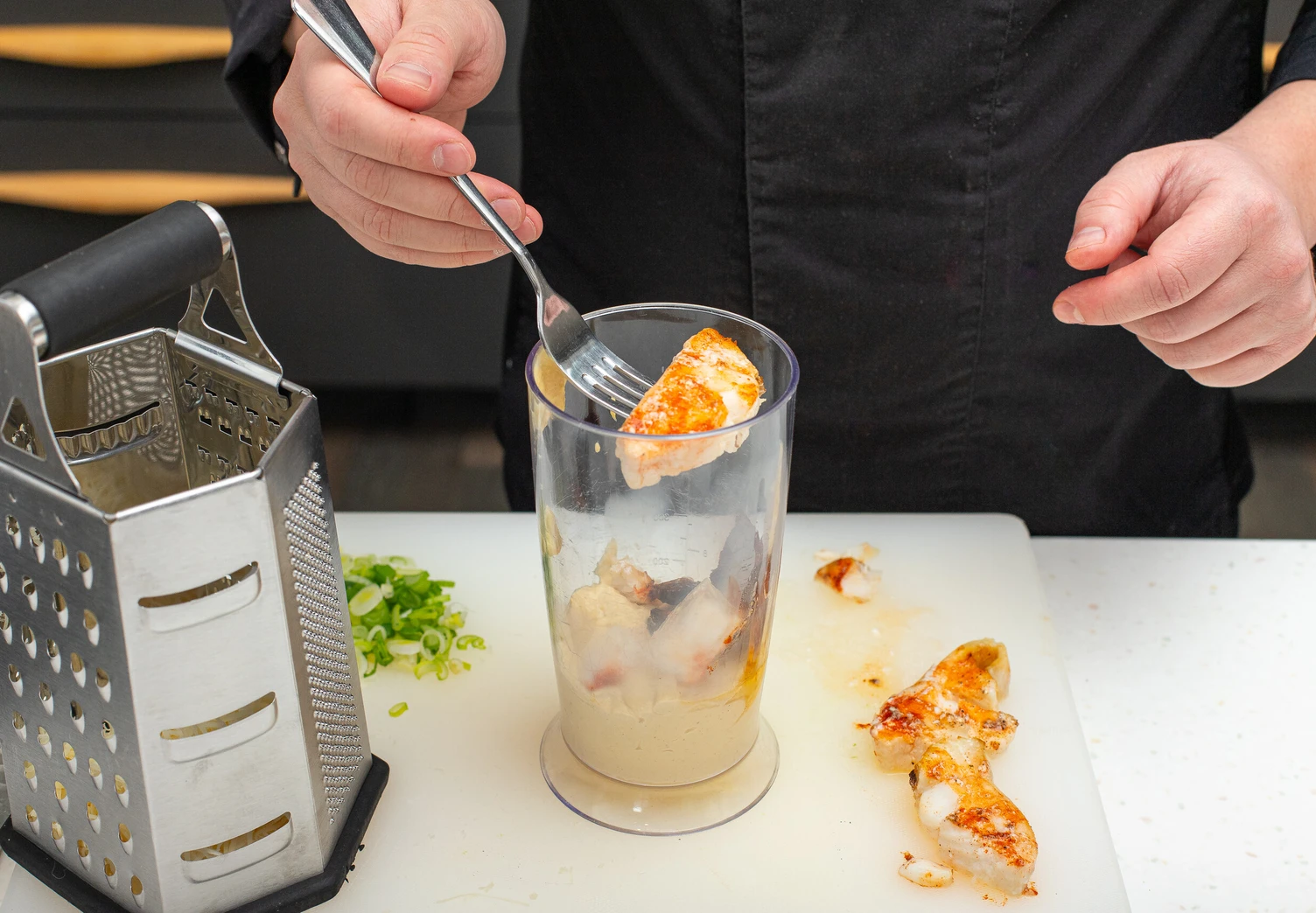 Пробейте запечённое филе зубатки со всеми ингредиентами, кроме сыра и лука, до однородной массы.