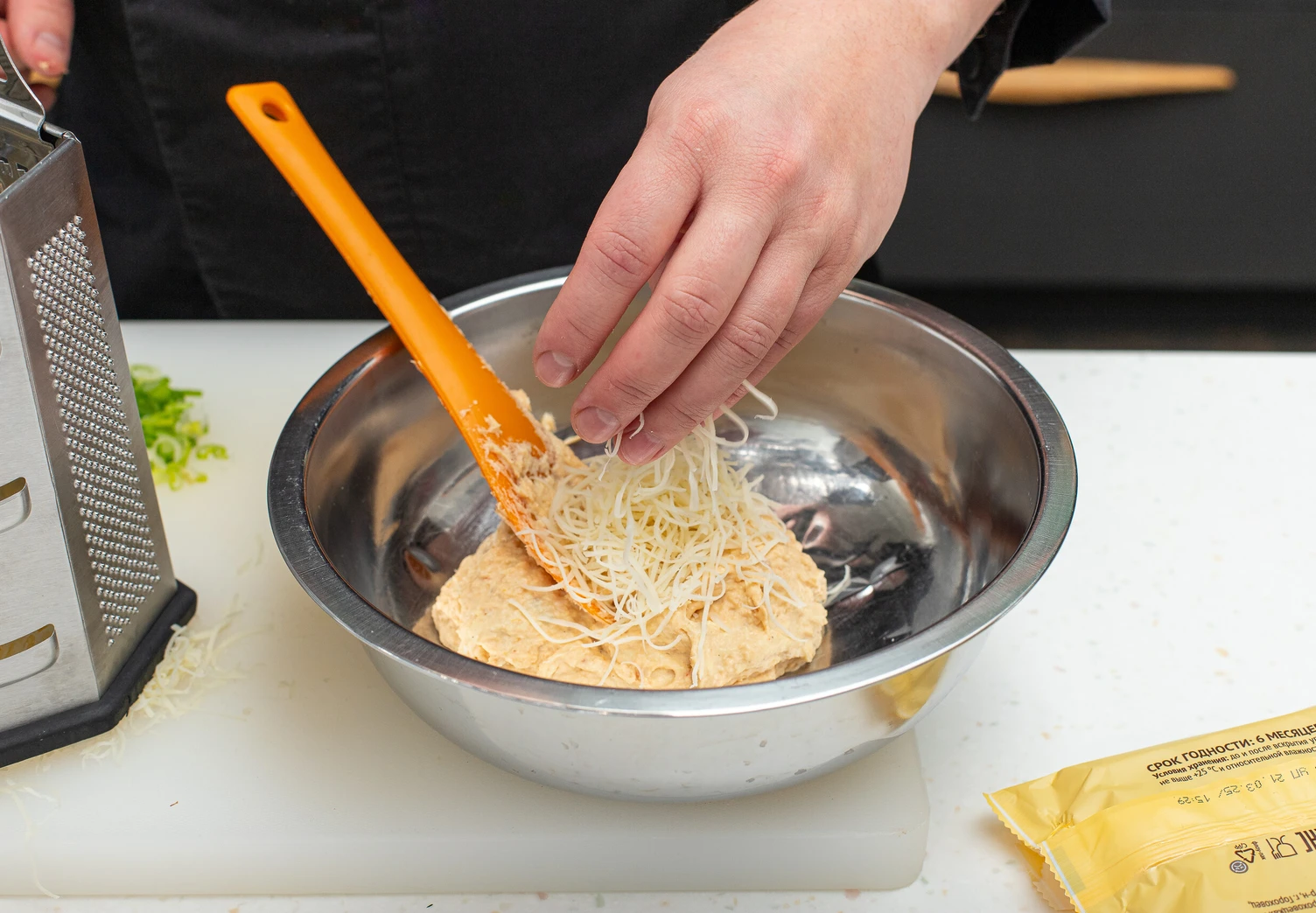 Сыр натрите на крупной тёрке и подмешайте к массе.