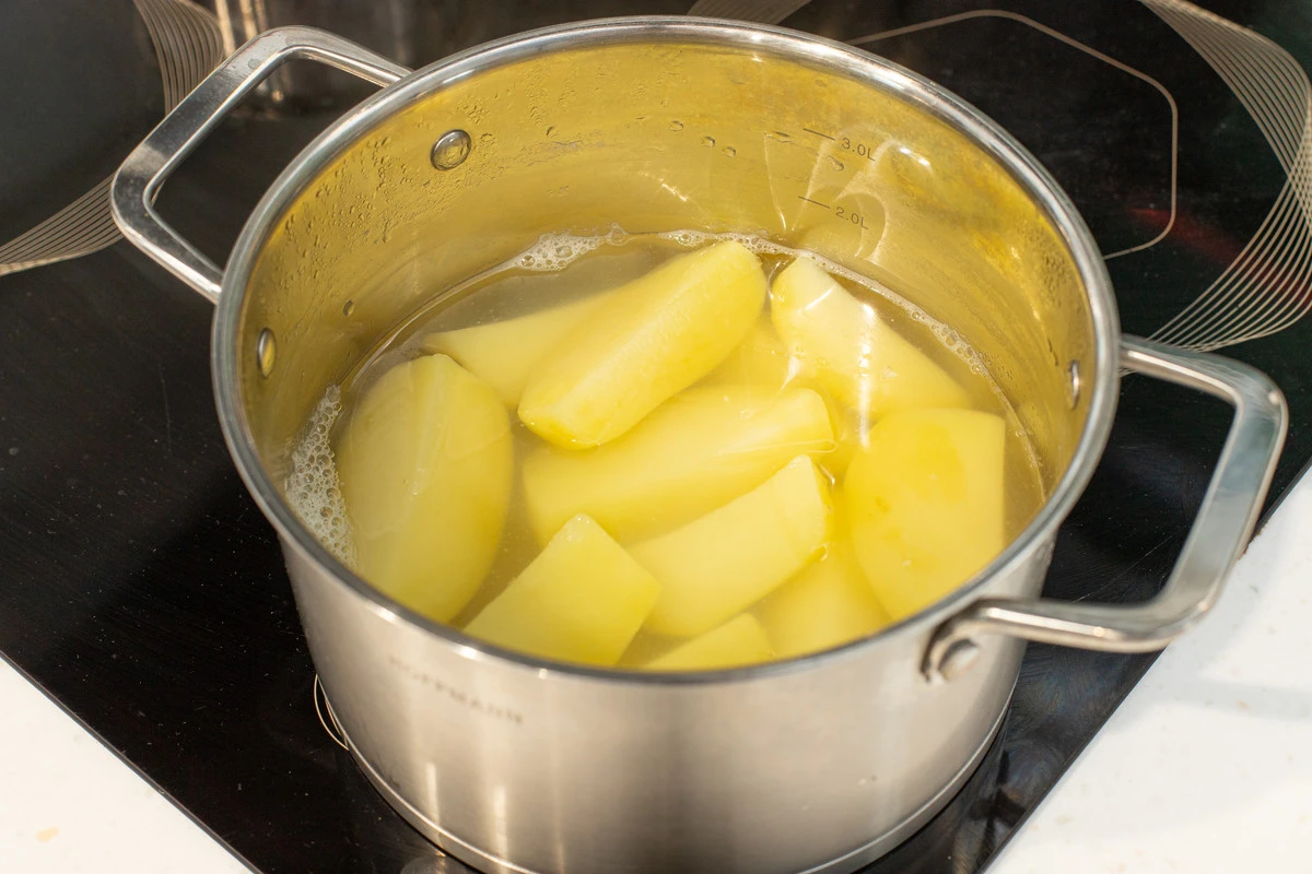 Картофель очистите, крупно нарежьте. Отварите до готовности (готовность проверьте ножом — если лезвие легко входит в клубень и выходит, значит, готов). Немного остудите. Воду слейте.