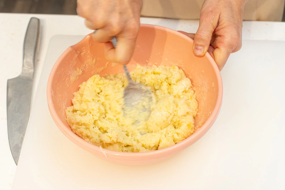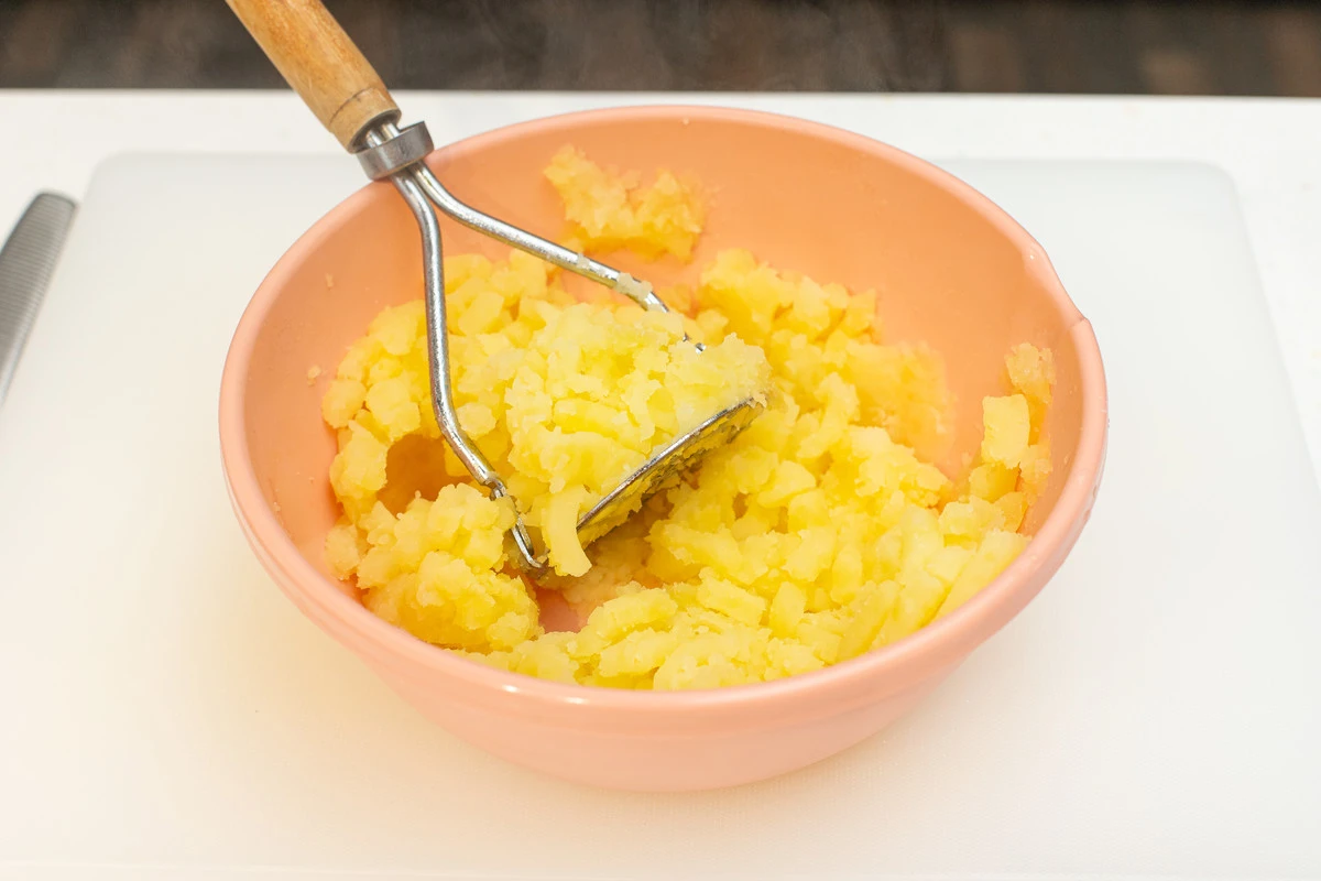 Выложите картофель в миску, помните толкушкой, добавьте щепотку чёрного молотого перца и соль, перемешайте.