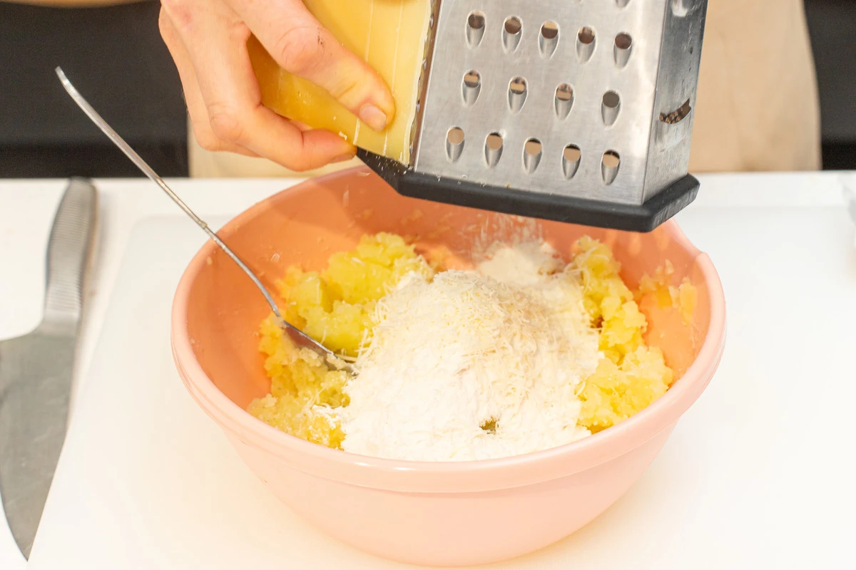 Добавьте 100 г муки и натёртый на мелкой тёрке пармезан. Перемешайте.