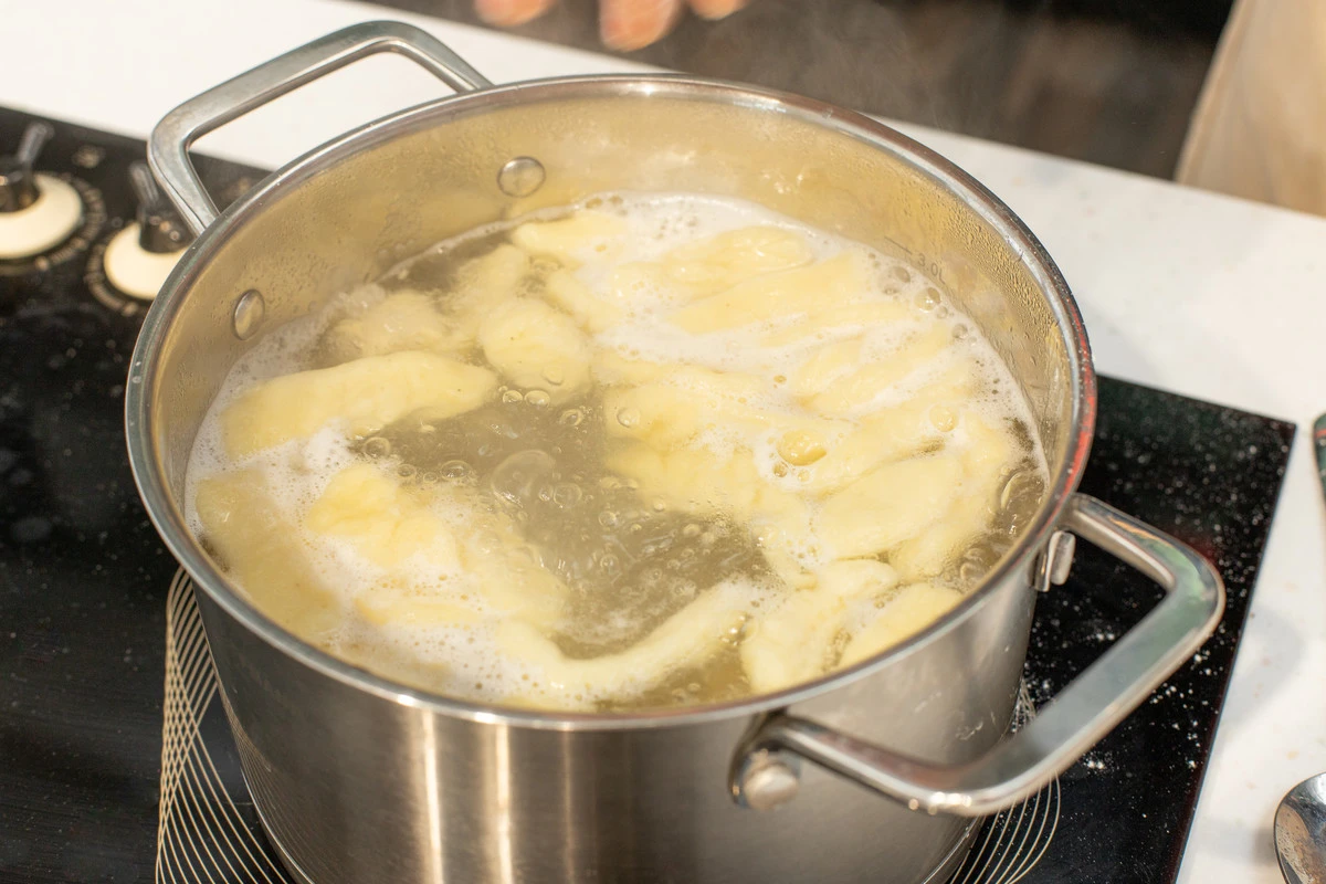 Вскипятите воду в большой кастрюле. Посолите — понадобится примерно 1 ч. ложка соли на литр воды. Сформируйте ньокки. Если будете делать узор вилкой, каждый раз обваливайте её в муке. Забросьте ньокки в кипящую воду и варите на среднем огне 3 минуты после того, как они всплывут.