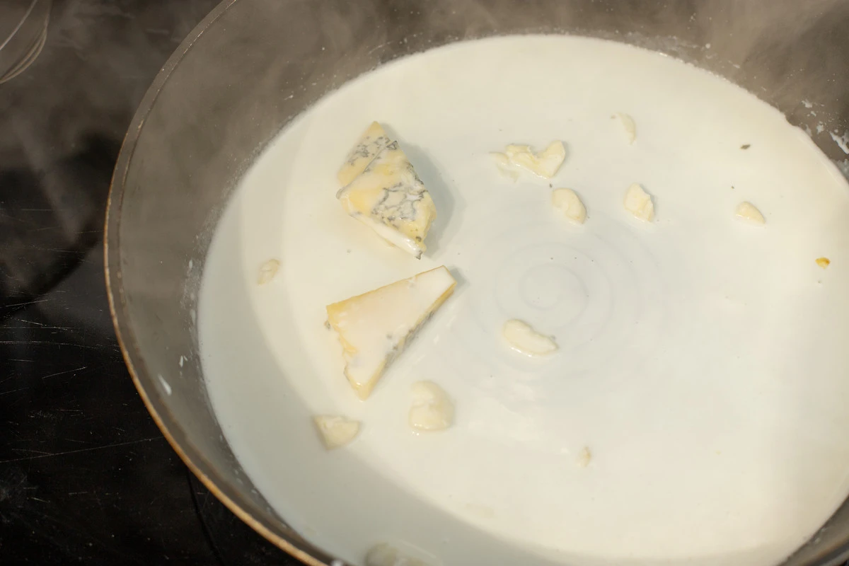 Чеснок мелко нарежьте. Разогрейте сухую сковороду, выложите в неё чеснок, добавьте сливки, нарезанную горгонзолу и готовьте, помешивая силиконовой лопаткой. Сыр должен полностью расплавиться, а соус стать однородным.