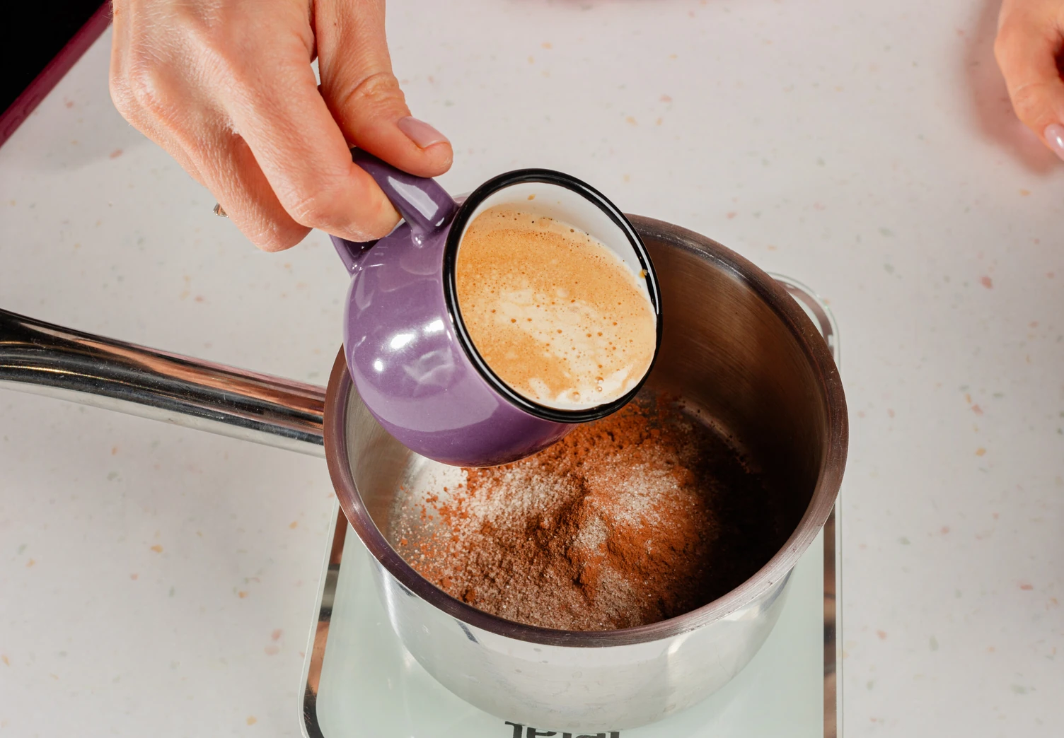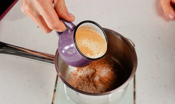 Перемешайте в сотейнике какао, горячий крепкий кофе и ванильный сахар.