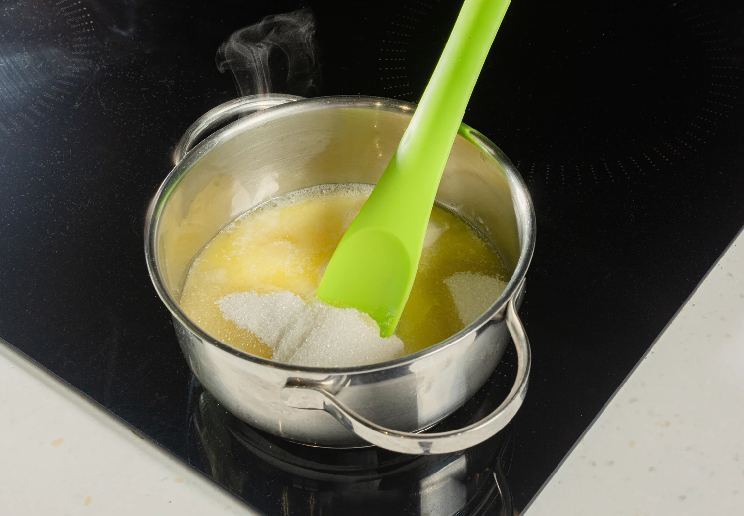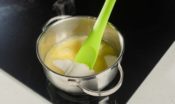 Растопите в сотейнике масло и сахар, снимите с огня и дайте массе остыть 10 минут.