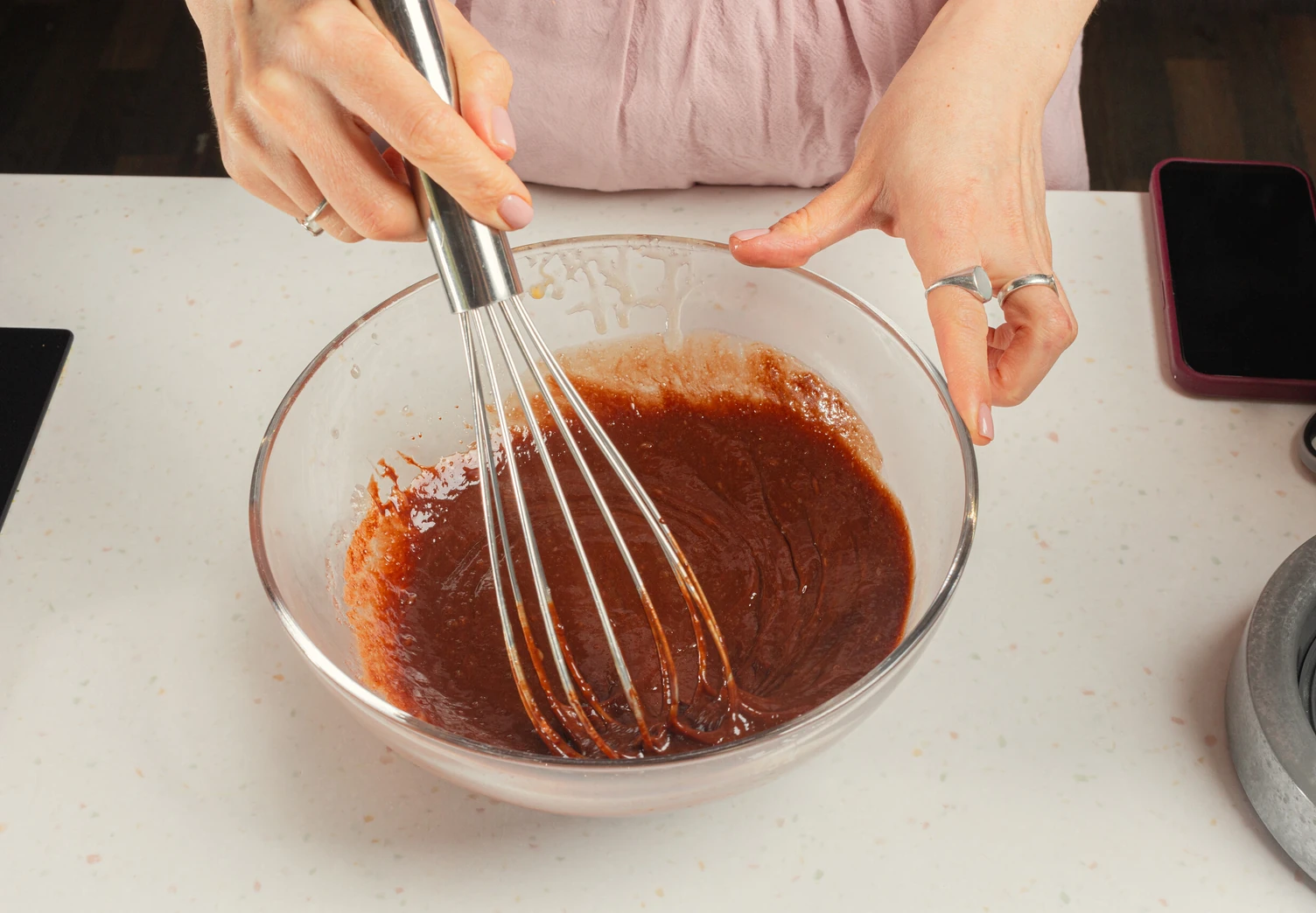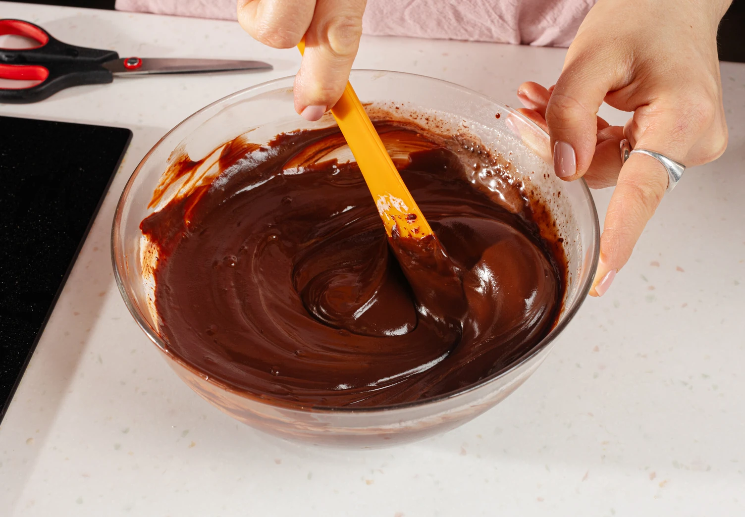 Влейте кефир, перемешайте. Завершите сухими ингредиентами.