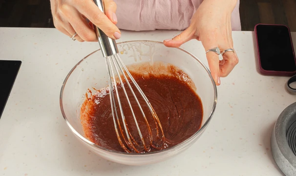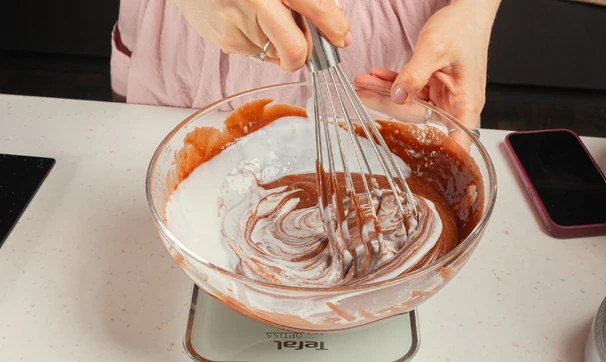 Добавьте по одному яйца, затем смесь какао и кофе.