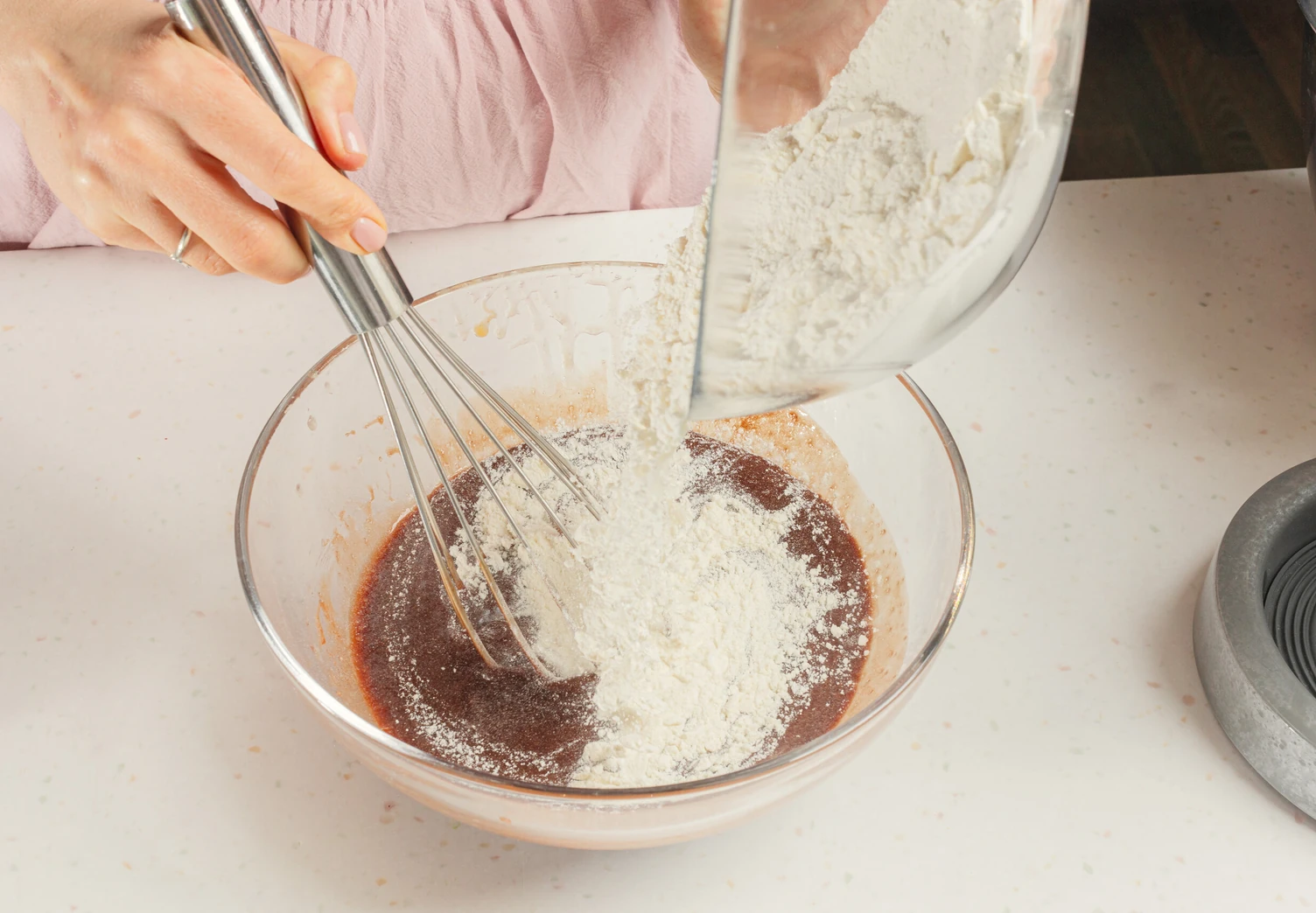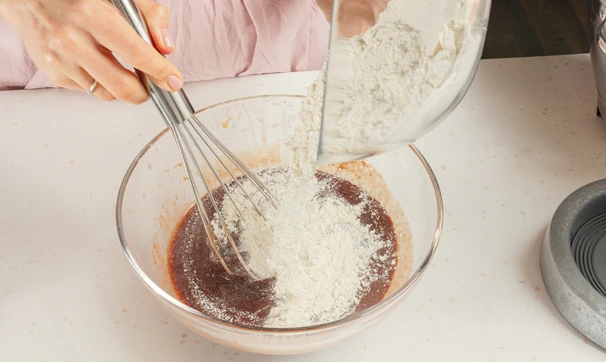 Соедините муку, разрыхлитель, соду и соль. Отправьте туда же половину сыпучих ингредиентов, размешайте.
