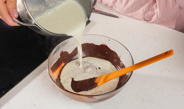 Для шоколадного крема сливки смешайте с сахарной пудрой и доведите до кипения. Добавьте тёмный шоколад, дайте постоять пару минут.