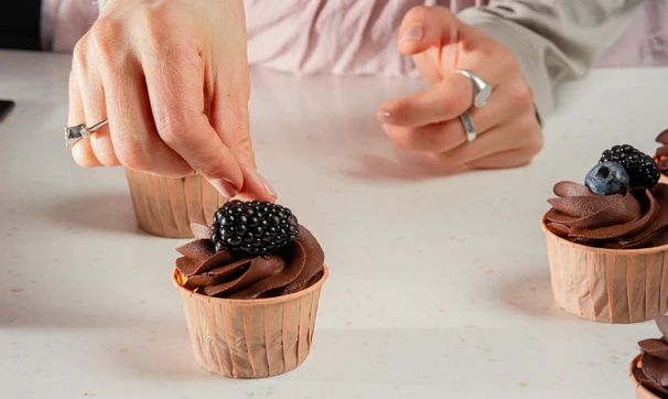 Сделайте на остывших капкейках шапочки из крема. Если он стал в холодильнике слишком твёрдым, дайте ему постоять при комнатной температуре полчаса. По желанию украсьте капкейки свежими ягодами.