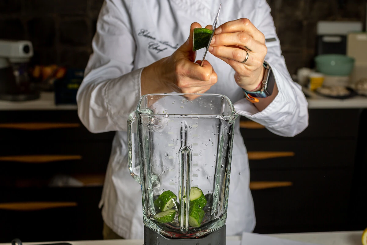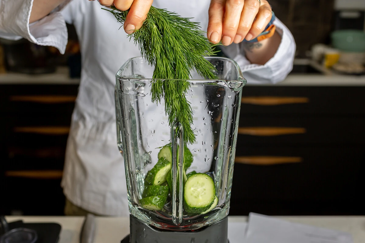 Огурцы помойте и отрежьте плодоножки. Нарежьте шайбами и положите в кувшин блендера.