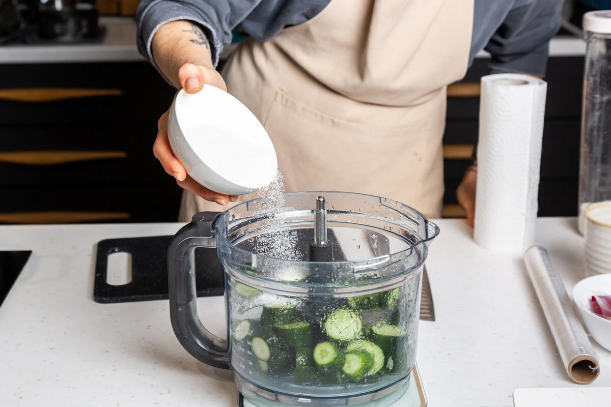 Огурцы нарежьте крупными шайбами. Для этого рецепта выбирайте сезонные молодые огурчики. Если кожица у огурцов плотная и жестковатая, лучше срежьте её. Если тонкая, лучше оставьте — так цвет сорбета получится ярче и насыщеннее.