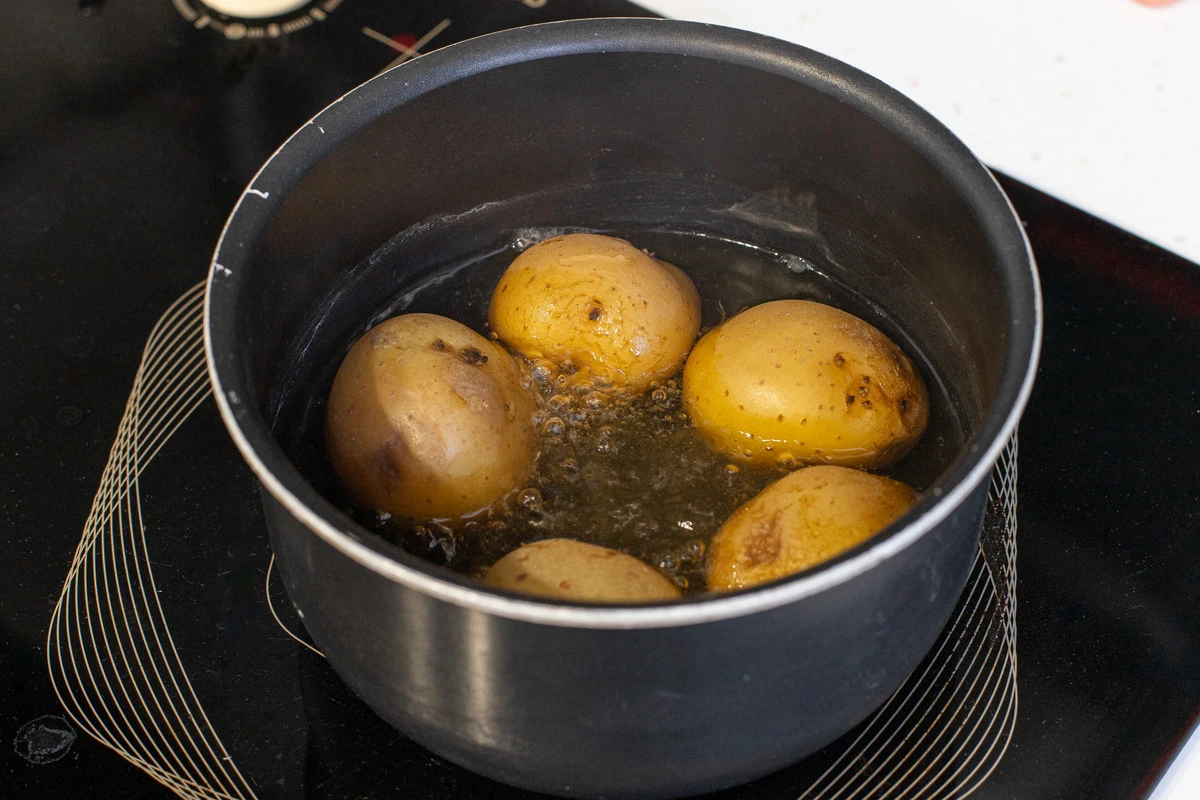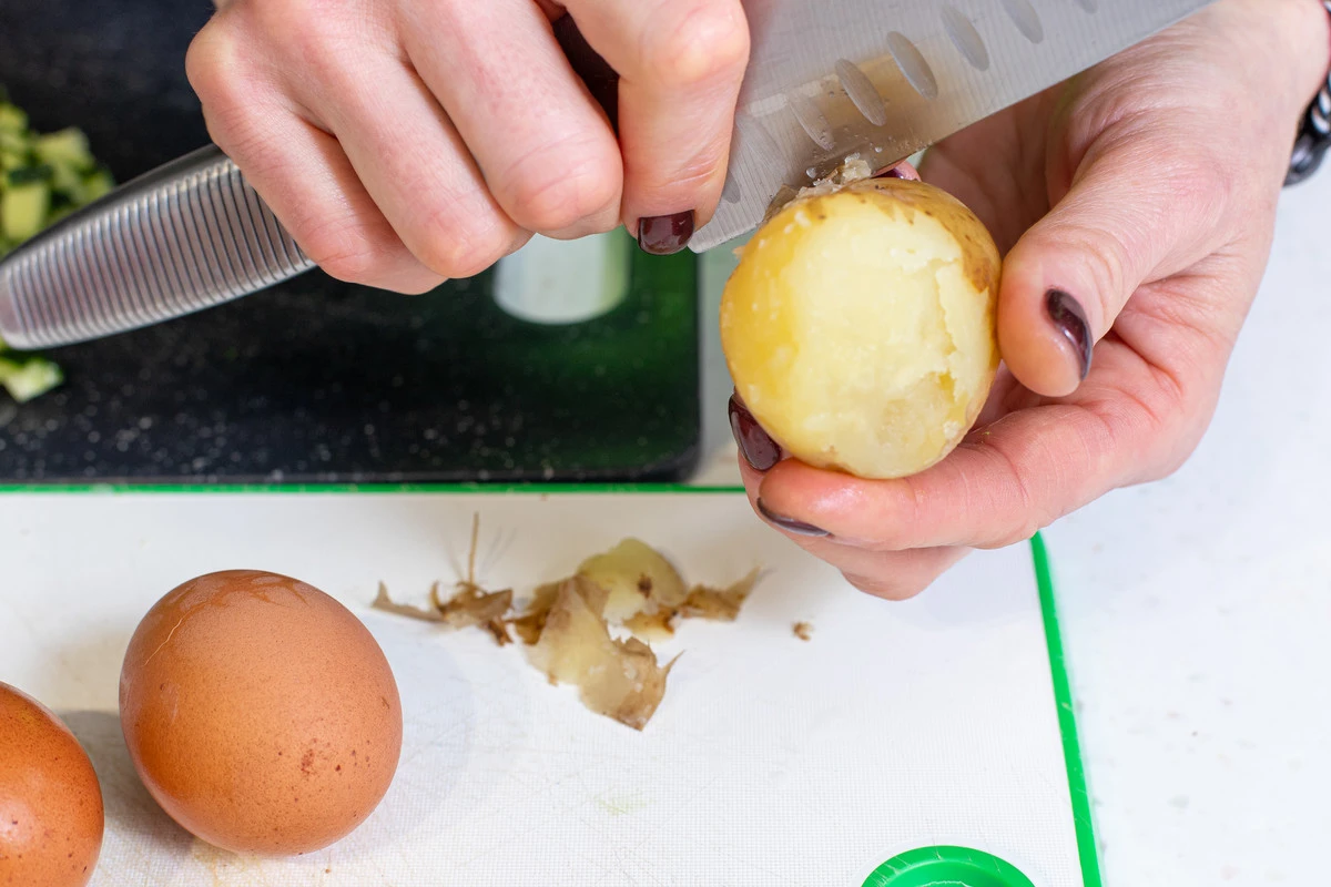 Картофель отварите в мундире до готовности, яйца сварите вкрутую. Остудите.