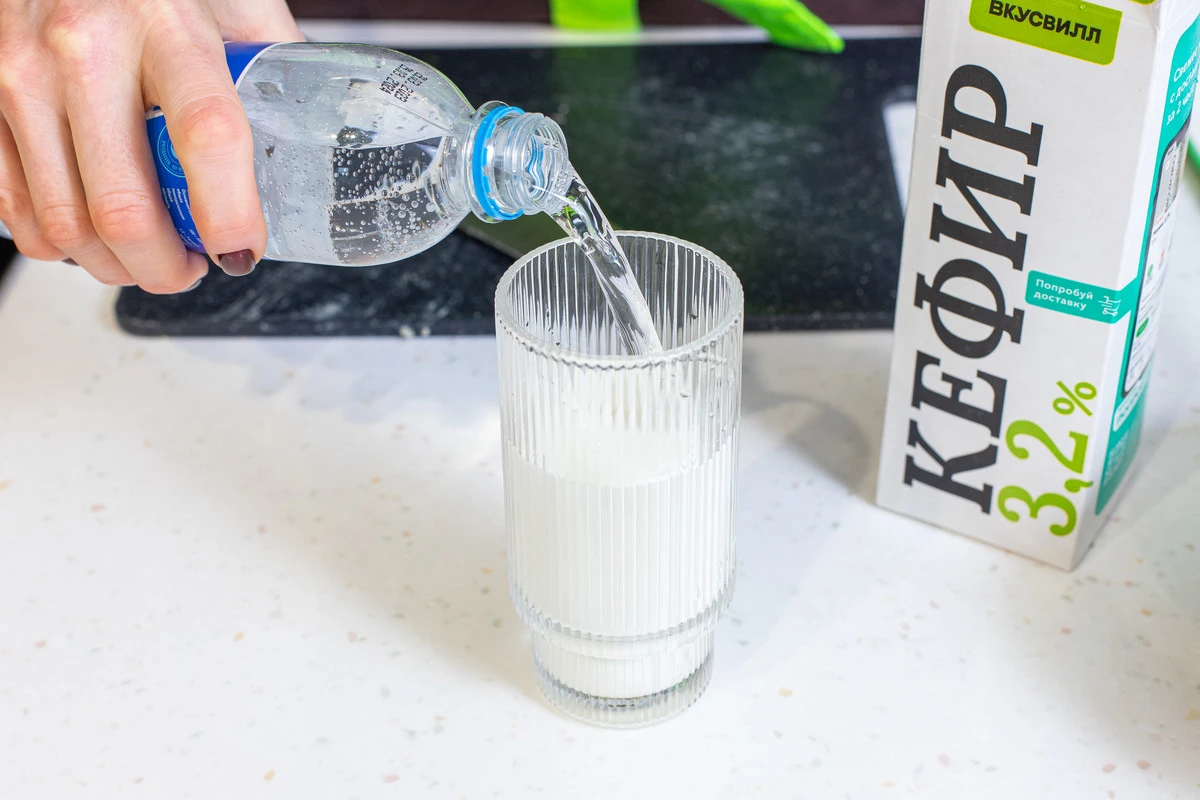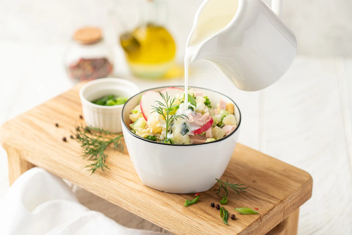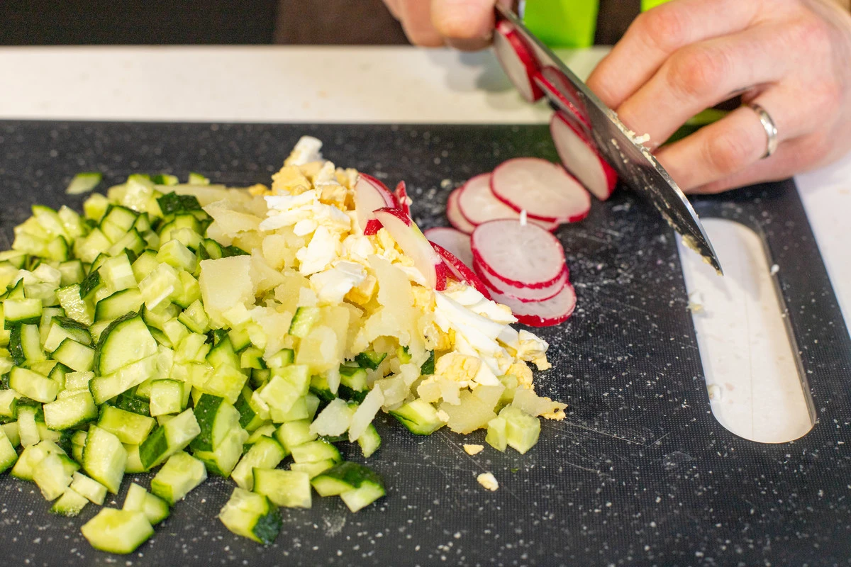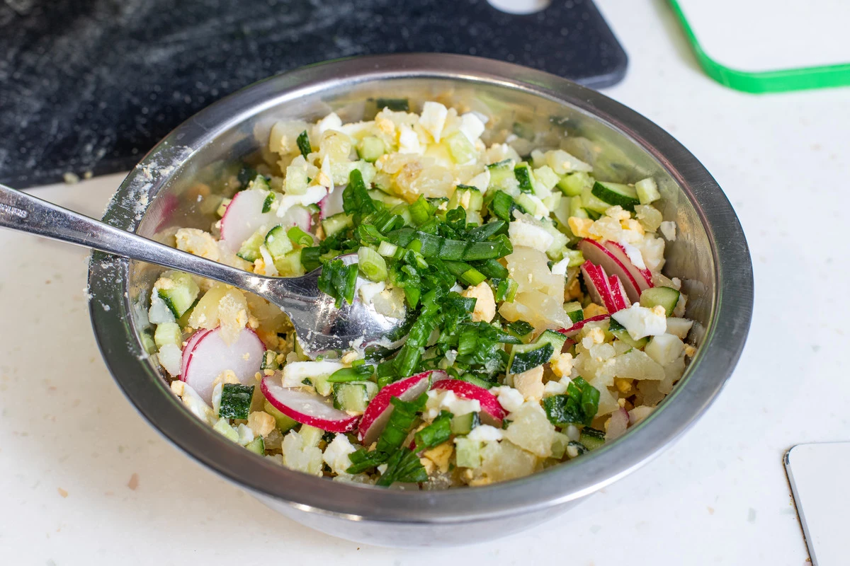 Залейте разбавленным кефиром овощи. Окрошка готова, можно подавать.