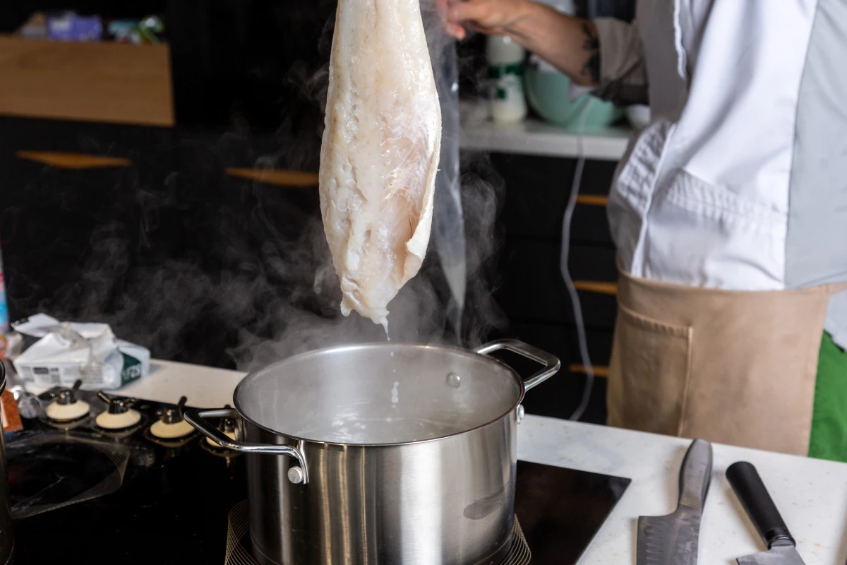 Отварить филе белой рыбы в подсоленной воде с лавровым листом, перцем горошком, можно добавить морковь и луковицу
