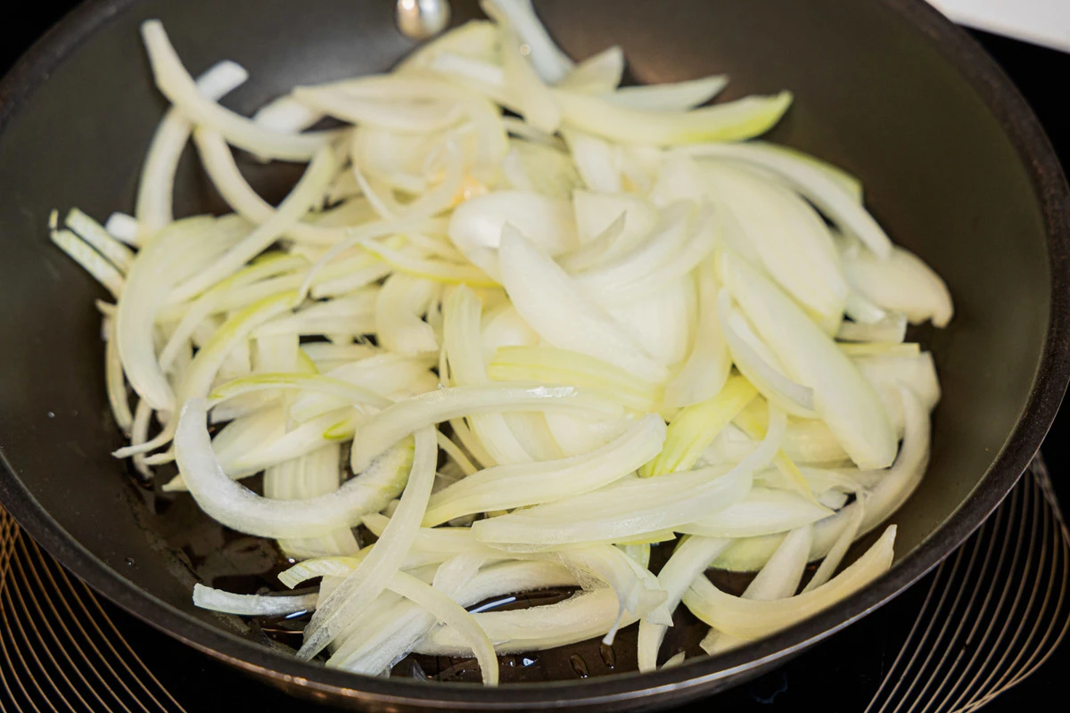 Разогрейте сковороду с 2 ст. ложками растительного масла и обжаривайте лук до золотистого цвета 3-4 минуты.