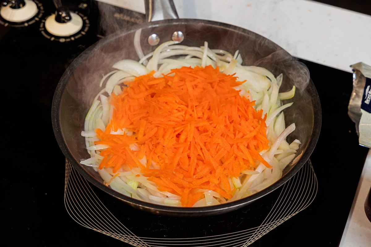 Добавьте к луку и продолжайте готовить на среднем огне ещё 5-7 минут.