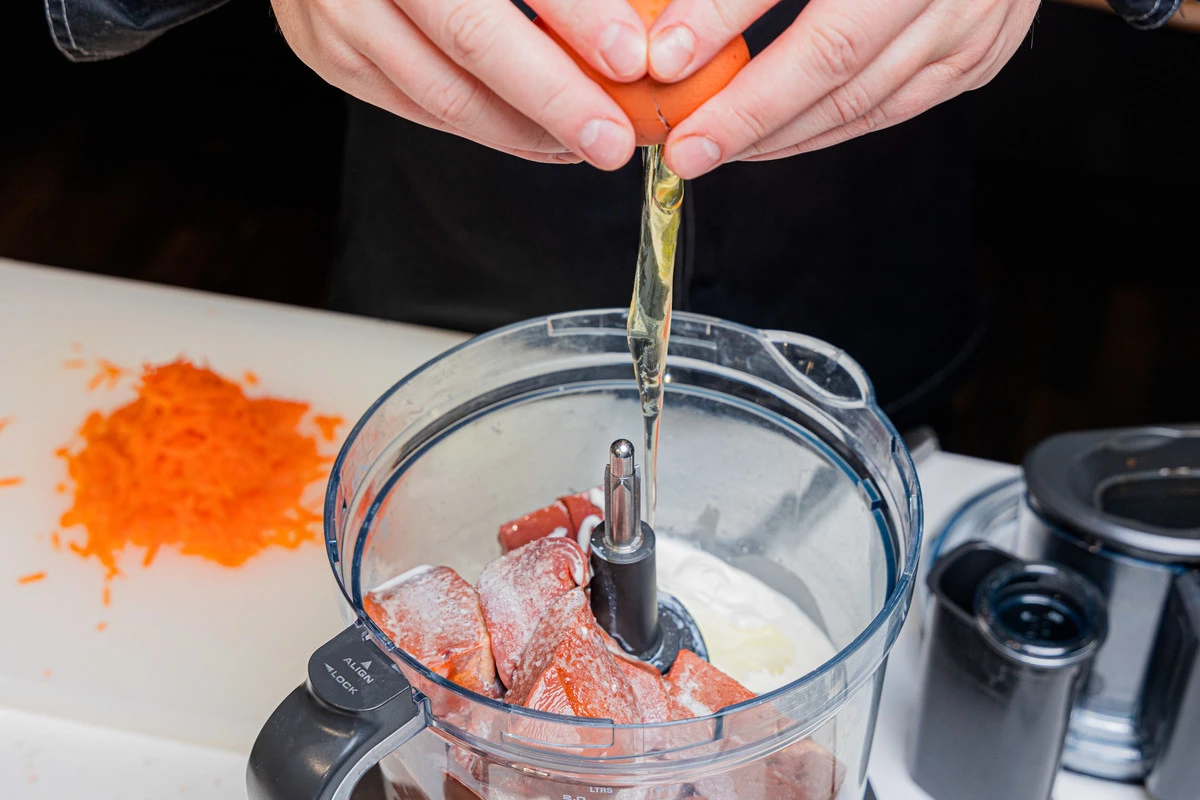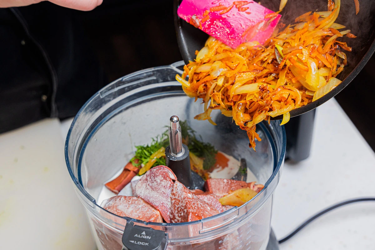 Положите в чашу комбайна или блендера жареный лук с морковью.