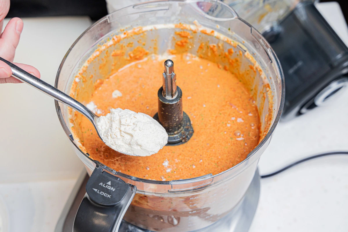 Добавьте 2 ст. ложки муки, разрыхлитель, перец и измельчите всё до однородности.