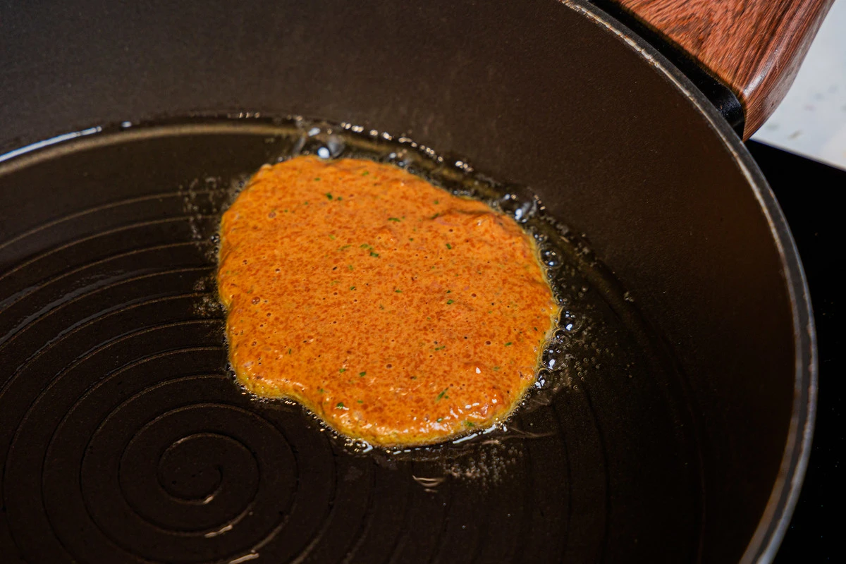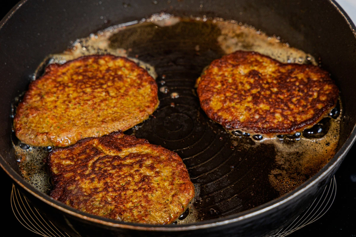 Разогрейте сковороду с 2 ст. ложками растительного масла. Выкладывайте подготовленное «тесто» для оладий на сковороду порциями.