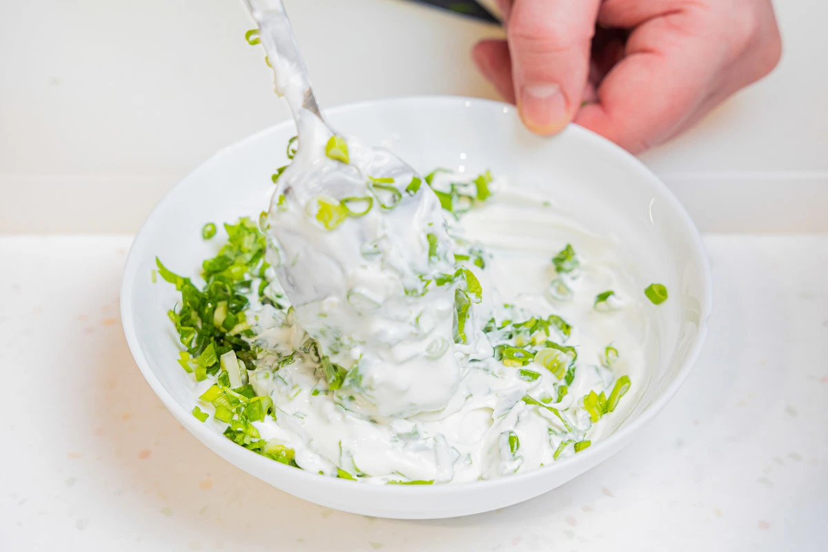 Сделайте соус. Мелко нарежьте зелёный лук и петрушку и смешайте со сметаной, посолите, перемешайте.