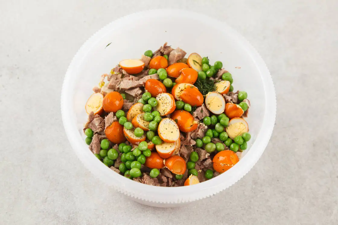 Зелёный горошек залейте кипятком и оставьте на пару минут, затем откиньте горошек на сито. Язык и огурцы нарежьте кубиками, яйца — половинками.