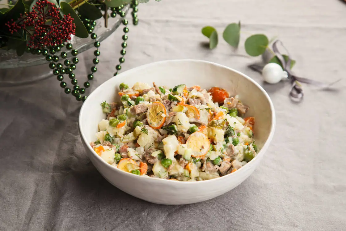 Необычный вкус этому оливье придают копчёные перепелиные яйца, а отварной язык — идеальный мясной ингредиент!