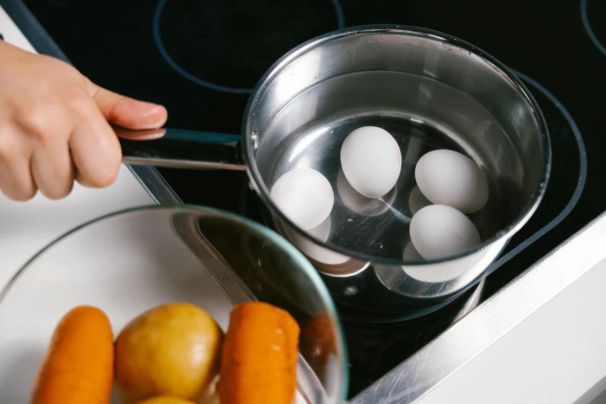 Картофель, морковь и яйца отварите. Слейте воду и дайте продуктам остыть. Если используете не готовую запечённую куриную грудку, а сырую, отварите её в кастрюле либо запеките на гриле или в духовке.