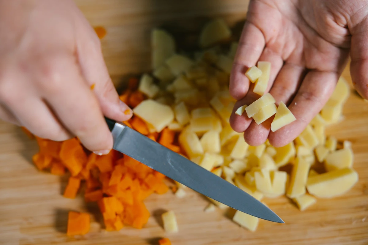 Нарежьте все ингредиенты — картофель, морковь, курицу, яйца, огурцы и манго — мелкими кубиками, размером примерно с горошину. С зелёного горошка слейте жидкость.
